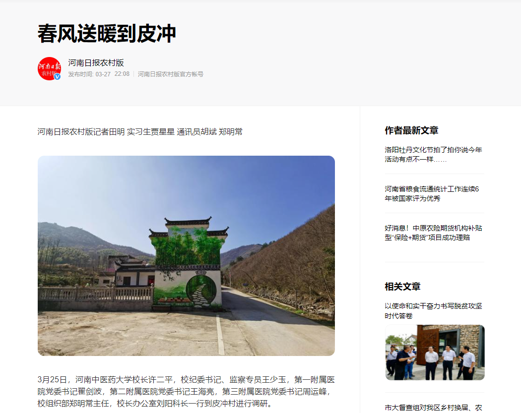 编者按:2021年3月26日,河南日报、今日头条对我校校长许二平,校纪委书记、监察专员王少玉一行到皮冲村调研进行报道。现将全文刊发如下: