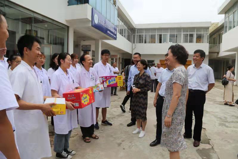 2019年7月8日,校党委副书记张丽霞带领研工部、校团委等部门负责人奔赴新县看望我校挂职副县长赵振营,并勉励他要充分利用学校资源,积极开展校地合作。7月9日-10日,张丽霞一行在赵振营的陪同下,深入新县人民医院、新县解放桥广场义诊服务点、羚锐制药芬太尼透皮贴剂生产基地、新县泗店乡卫生院等地看望慰问我校参加暑期“三下乡”社会实践活动的师生。在活动现场,张丽霞详细了解了我校社会实践团队为群众进行义务诊疗和中药普查活动的情况,并为社会实践队员送去了慰问品,她叮嘱大家在新县这片热土上要更加认真学习红色精神,并运用到社会实践过程中,加强理论知识与社会实践的结合,尽最大可能向基层群众传播中医药文化和知识,用不畏困难、迎难而上的精神圆满完成暑期社会实践活动。
