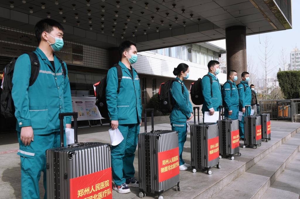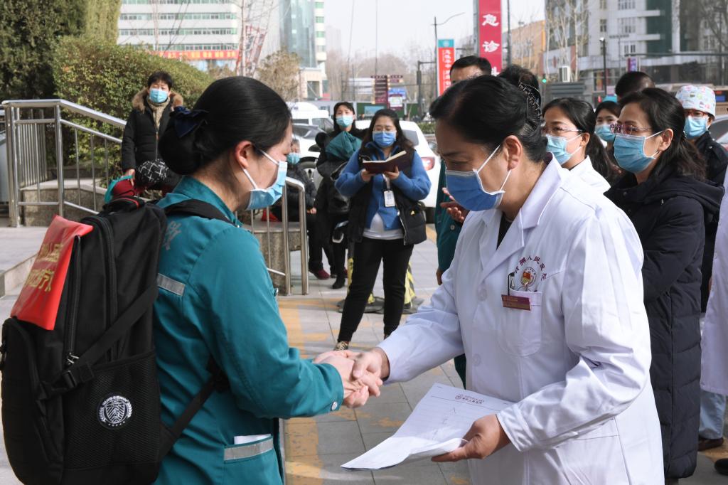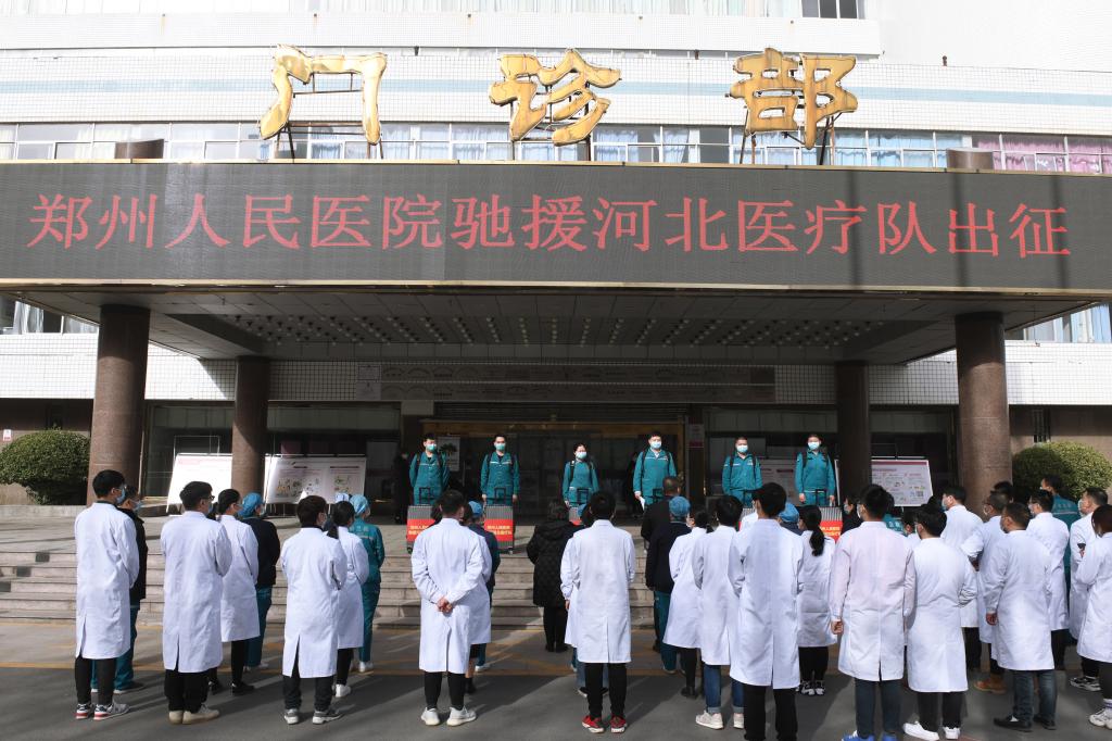 仪式结束后,黄娟、护理部主任王贺、急诊科主任巫庆荣在郑州市紧急救援中心为人民医院驰援河北医疗队队员送行。