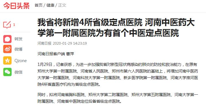编者按;2020年1月29日,河南日报客户端对我校一附院拟定为省级定点医院进行报道。现将全文刊发如下: