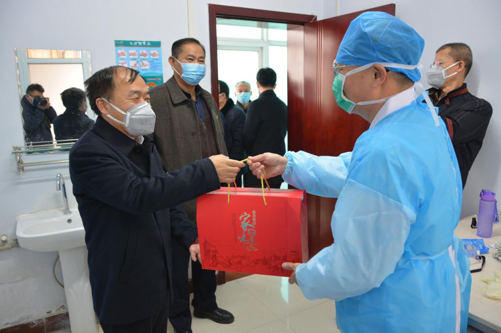 本网讯(文/李志刚 图/田辉 潘向昆)豕去春无限,鼠来岁有余。1月23日,腊月廿九。在这阖家团圆,喜气祥和的日子里,我校三附院党委书记周运峰和班子成员看望慰问节日期间仍坚守在临床一线的值班人员,向他们表示新春的问候和美好的祝福。