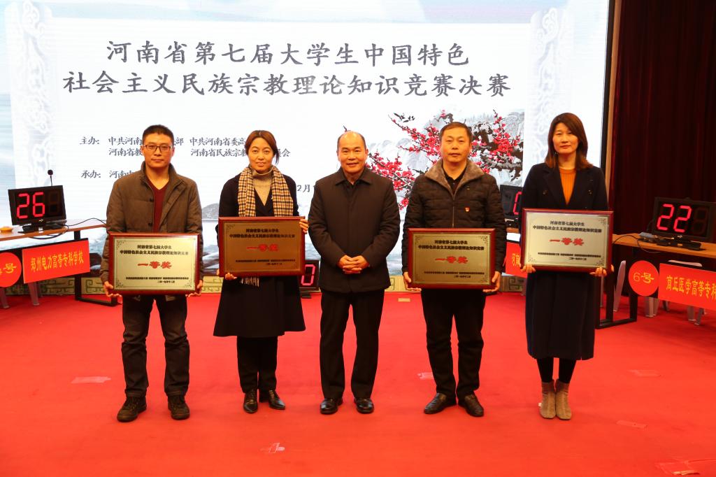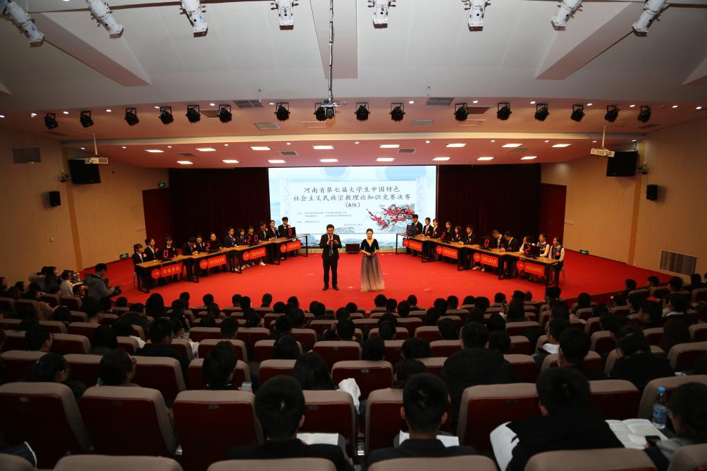 本网讯(文/王谦 图/李昕)为学习贯彻习近平新时代中国特色社会主义思想,宣传党的民族宗教政策,普及国家有关法律法规,促进大学生牢固树立马克思主义民族宗教观,2019年12月18日下午,由中共河南省委统战部、中共河南省委高校工委、河南省教育厅、河南省民族宗教事务委员会联合主办,我校承办的河南省第七届大学生中国特色社会主义民族宗教理论知识竞赛决赛在校图书馆第一报告厅举行。来自全省高校的16支代表队参赛,32所高校参与了观摩。省委统战部副部长梁险峰,高校工委专职委员高治军,省民族宗教事务委员会宗教二处处长靖锐,省委高校工委、省教育厅副总督学韩冰,省委高校工委、省教育厅统战处副处长高峰,我校党委副书记张丽霞,党委委员、党委统战部部长仲利娟及我校各有关职能部门负责人出席比赛,来自省内的32所高校代表和我校师生300余人在现场观看比赛。