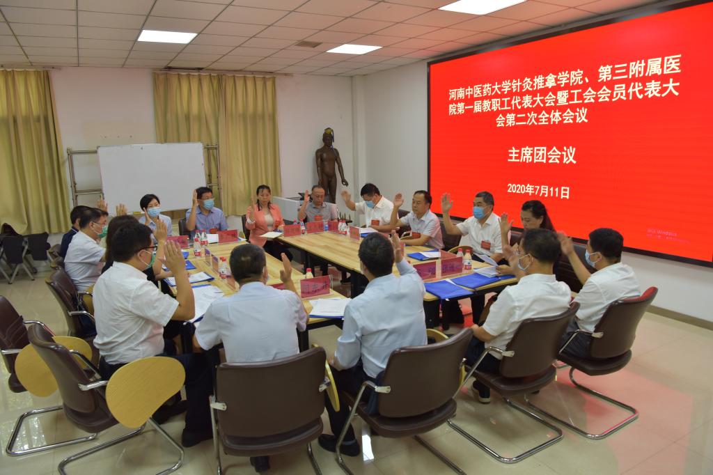 会后,各代表团进行分团讨论,讨论审议了医院行政工作报告等六个工作报告。分团讨论结束后,大会主席团全体成员认真听取了各代表团团长对各分团讨论情况的汇报,并集体讨论了大会决议(草案)。闭幕会上,举手表决通过了医院行政工作报告、财务工作报告、工会工作报告等六个工作报告和亚盈app(中国)官方网站针灸推拿学院、第三附属第一届“双代会”第二次全体会决议(草案)。
