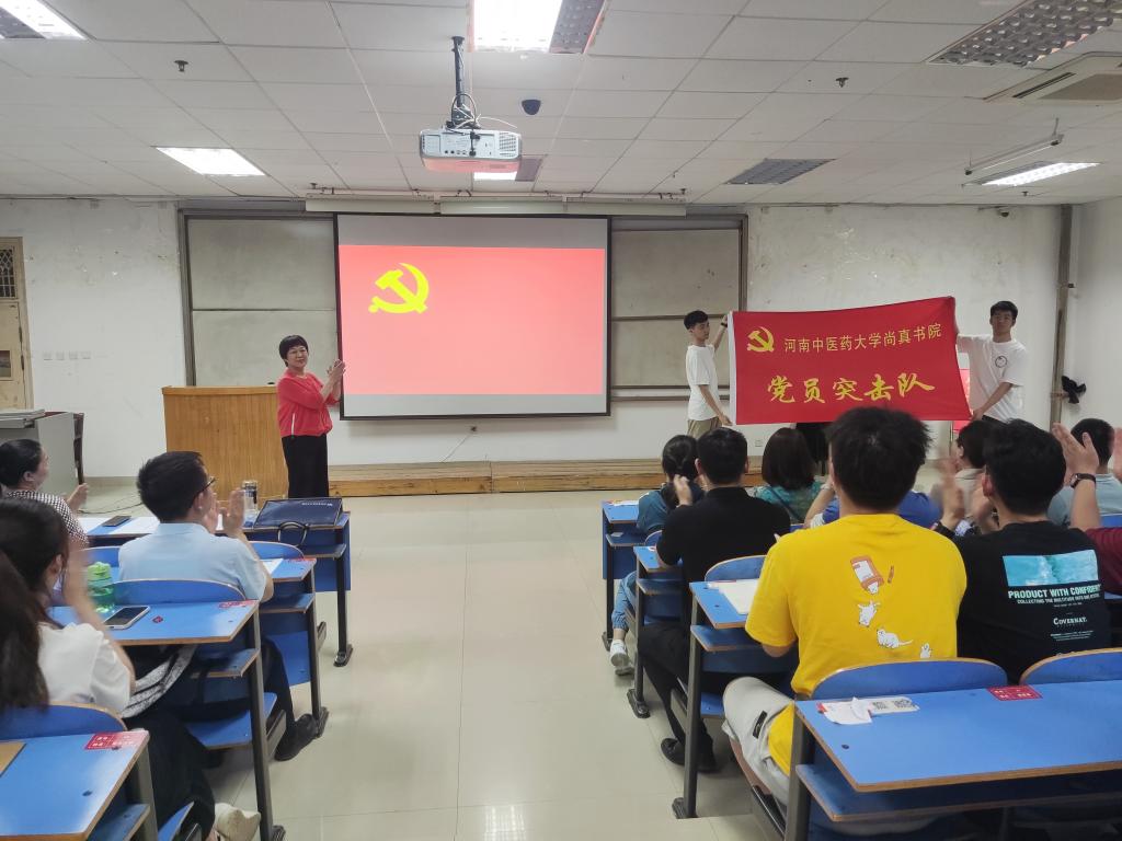 时慧宣读了尚真书院“党员突击队”倡议书;李志轩带领全体党员重温入党誓词;李俊芝为尚真书院“党员突击队”授旗;梁振代表全体学生党员做表态发言。