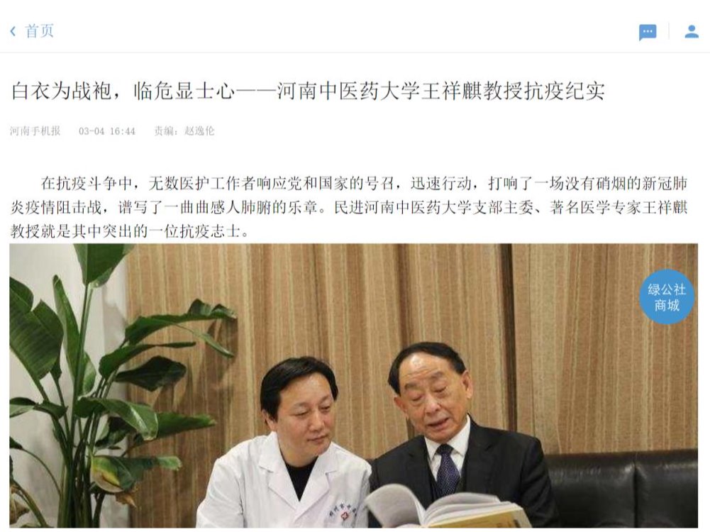 王祥麒教授医术高超,平时全国各地慕名找他看病的病人络绎不绝,门诊挂号常常供不应求,他的工作异常忙碌。除夕夜,忙碌了一年的王教授回到老家邓州,本可以和亲人们一起欢度佳节,共享天伦之乐。但当他听说春节期间仅从武汉返回邓州的务工人员和学生就有3.2万人,邓州疫情防控形势异常严峻时,他毫不犹豫地放弃了难得的休息时间,主动与南阳国医大师唐祖宣联系,参与到当地抗击疫情的战斗中。
