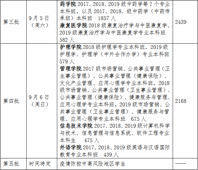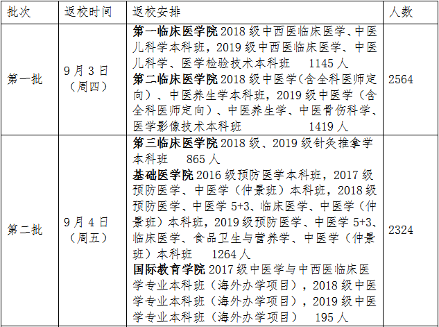 东风路校区上课的第二临床医学院2017级中医学本科(含全科医师)、2018级医学影像技术本科专业,合计565人,于9月5日返校,疫情防控中高风险地区学生返校时间待定。