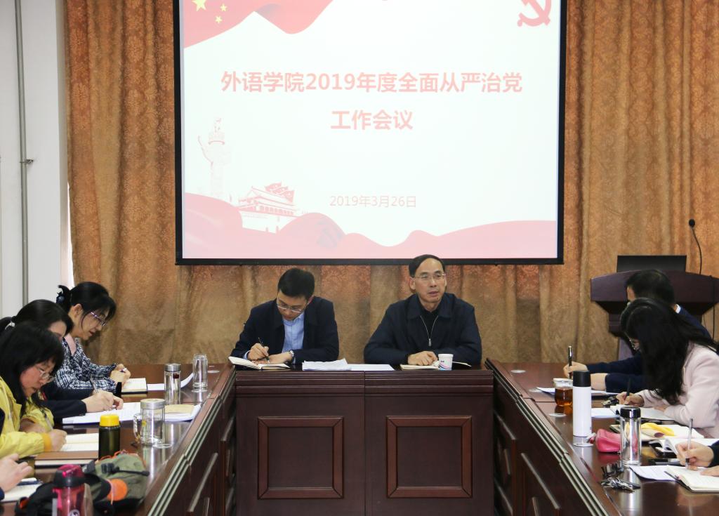 本网讯(文/马笑峰 图/胡志伟)为进一步贯彻落实全面从严治党责任要求,2019年3月26日下午,外语学院在教学实验大楼A638召开2019年度全面从严治党工作会议。校党委委员、工会主席张加民出席会议并讲话,外语学院领导班子、各科室主任、教研室主任、党支部书记、教师党员参加会议。会议由外语学院党委书记段其波主持。