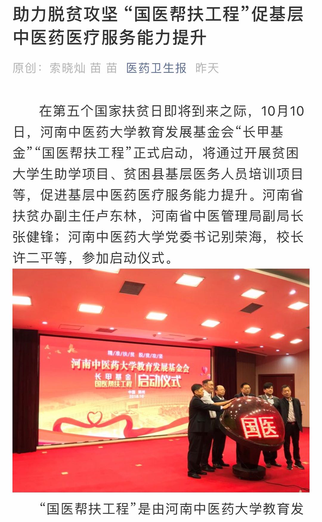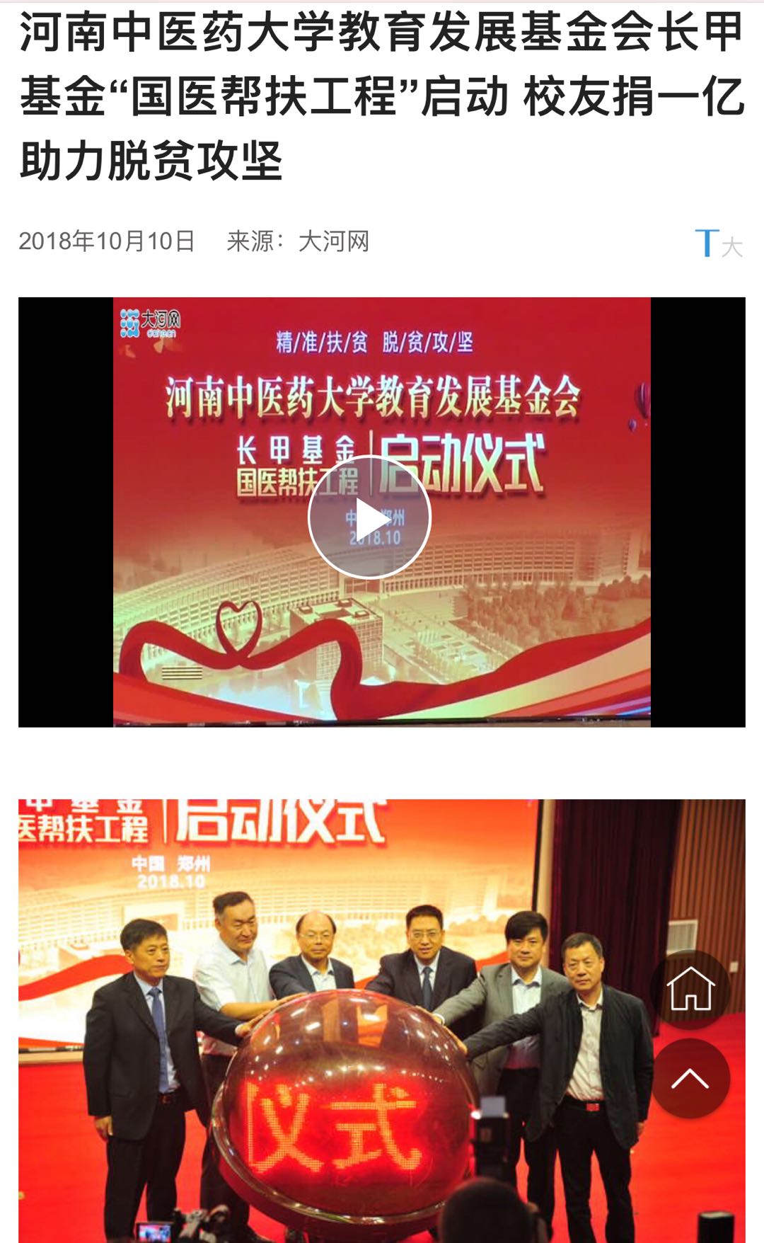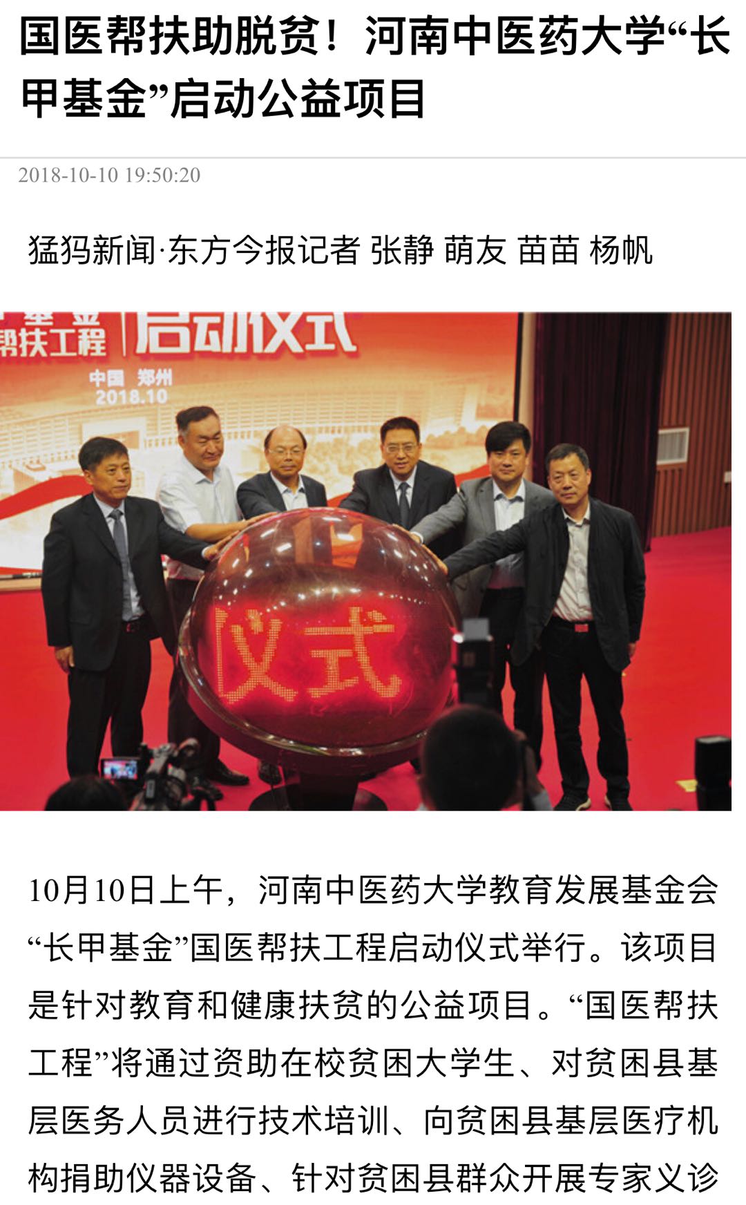 编者按:2018年10月10日上午,亚盈app(中国)官方网站教育发展基金会“长甲基金”国医帮扶工程启动仪式在图书馆第一报告厅举行,河南省扶贫办副主任卢东林、扶贫处处长李红军,省中医管理局副局长张健锋,长甲集团副董事长、长甲资本总裁张文浩和校党委书记别荣海、校长许二平共同按下启动球,我校教育发展基金会“长甲基金”国医帮扶工程正式启动。吸引了光明网、河南日报、大河报、大河网、东方今报、郑州晚报、医药卫生报、大河健康报等媒体的密切关注和广泛报道。大河网对启动仪式进行了网上全程直播,受到社会各界和广大师生的一致好评。现将部分相关媒体的报导情况汇总如下。(苗苗)