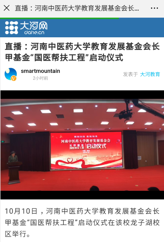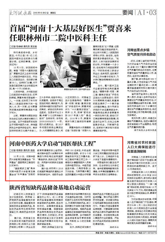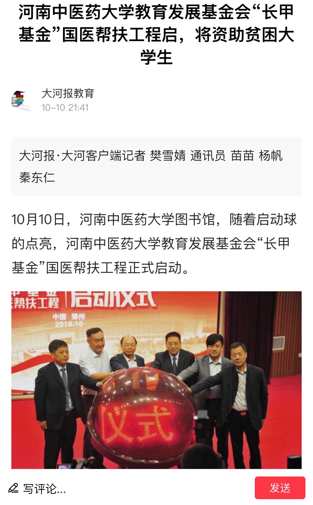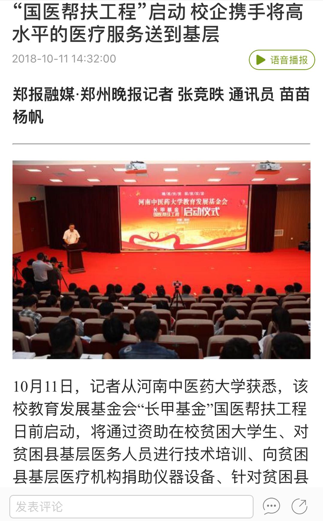 编者按:2018年10月10日上午,亚盈app(中国)官方网站教育发展基金会“长甲基金”国医帮扶工程启动仪式在图书馆第一报告厅举行,河南省扶贫办副主任卢东林、扶贫处处长李红军,省中医管理局副局长张健锋,长甲集团副董事长、长甲资本总裁张文浩和校党委书记别荣海、校长许二平共同按下启动球,我校教育发展基金会“长甲基金”国医帮扶工程正式启动。吸引了光明网、河南日报、大河报、大河网、东方今报、郑州晚报、医药卫生报、大河健康报等媒体的密切关注和广泛报道。大河网对启动仪式进行了网上全程直播,受到社会各界和广大师生的一致好评。现将部分相关媒体的报导情况汇总如下。(苗苗)