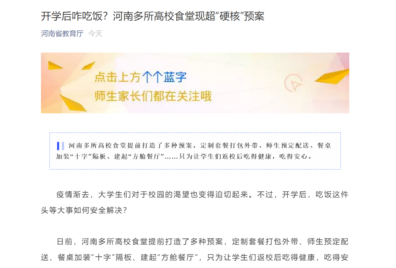 编者按:2020年03月22日,河南省教育厅官微对我校食堂超硬核预案进行报道。现将部分文章刊发如下: