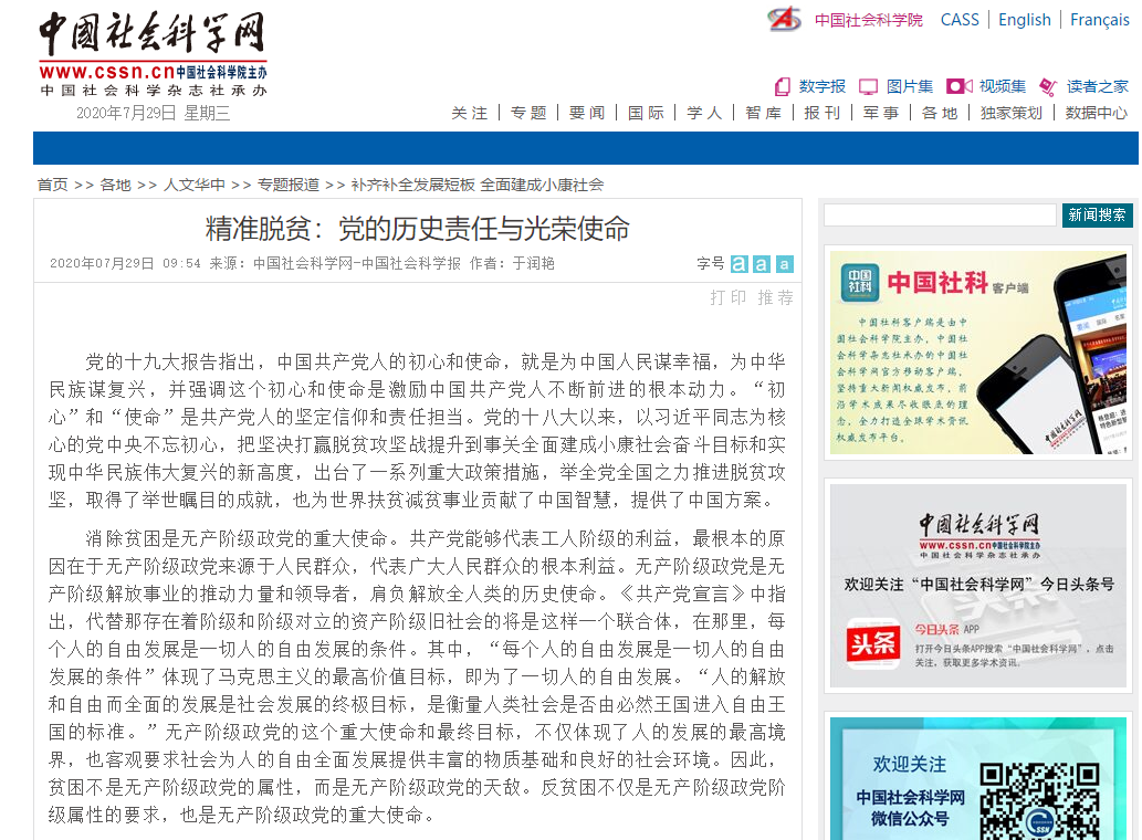 编者按:2020年7月29日,由中国社会科学院主办的中国社会科学网以《精准脱贫:党的历史责任与光荣使命》为题,发布我校马克思主义学院教师于润艳理论文章。现在内容发布如下: