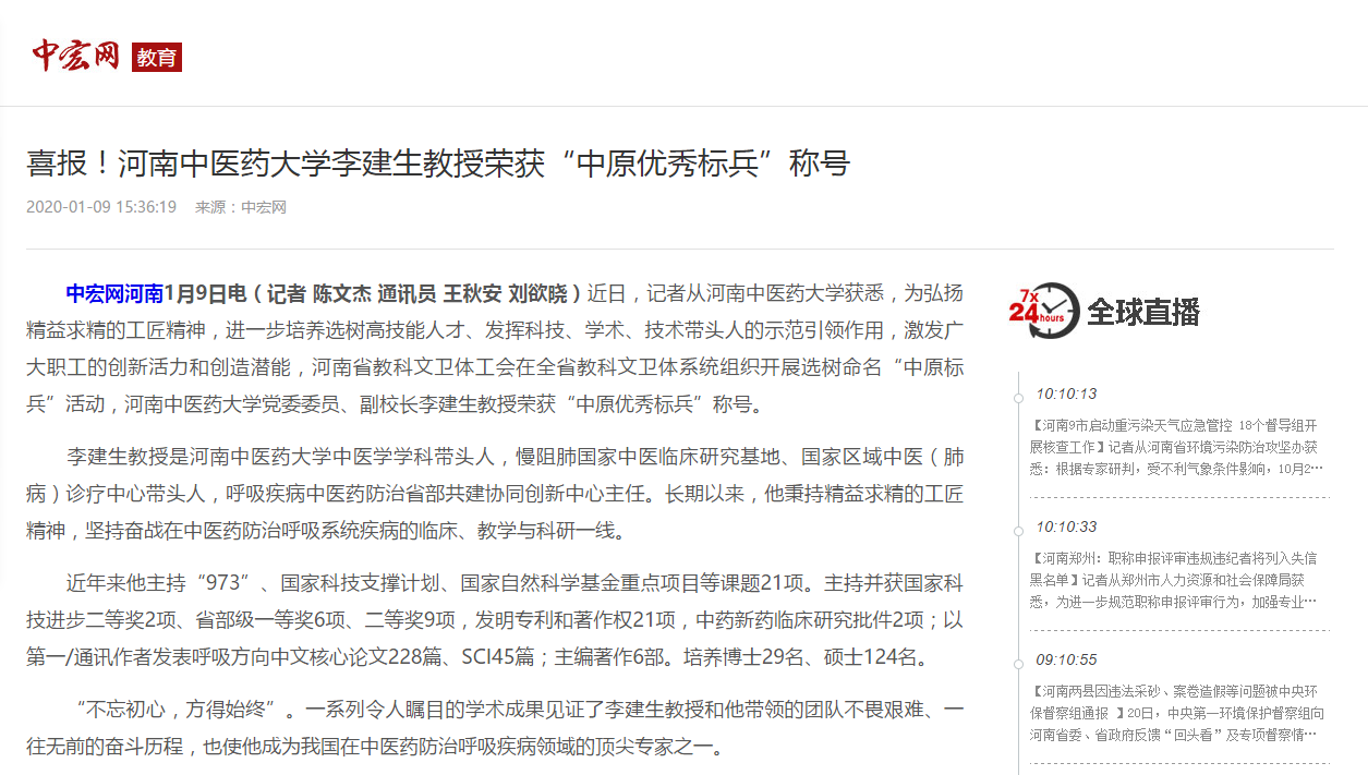 编者按:2020年1月9日,中宏网对我校党委委员、副校长李建生荣获“中原优秀标兵”称号进行报道。现将全文刊发如下: