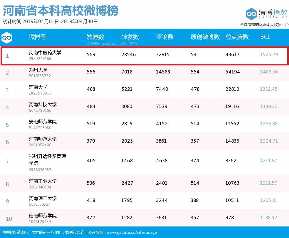本网讯(文图/秦元刚)近日,根据清博大数据发布的新媒体最新统计数据,2019年4月1日至4月30日,我校官方微博发博数569,转发数28546,评论数32815,原创微博数541,总点赞数43617,浏览量达1000万余人次,BCI指数1525.29,位居“河南教育系统微博榜”“河南省本科高校微博榜”双榜首。