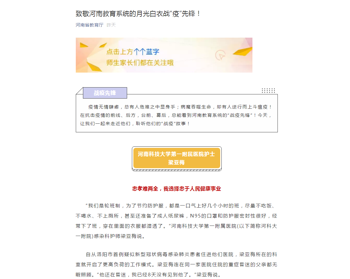 编者按:2020年2月27日,河南省教育厅官微对我校援鄂医疗队的“战疫”故事进行报道。现将部分文章刊发如下: