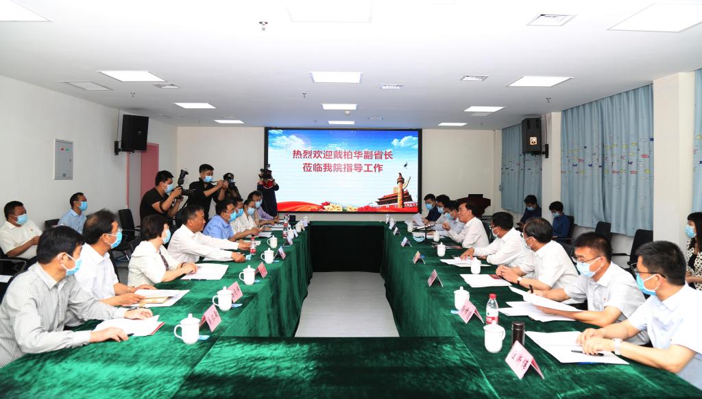本网讯(文/何世桢 图/张金环 冯超)2020年5月16日下午,省政府副省长戴柏华带领副秘书长黄东升、省卫生健康委主任阚全程、省卫生健康委副主任张智民到一附院调研落实全省卫生健康大会精神、新冠肺炎疫情防控、支持中医药事业发展、推进重点项目建设等工作。我校党委书记别荣海,一附院党委书记翟剑波、院长朱明军等全体班子成员及相关科室负责人参加调研。