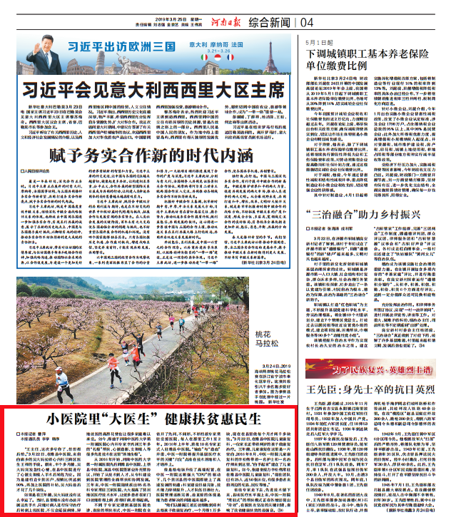 本网讯(文图/韩序)2019年3月25日,《河南日报》第4版以《小医院里“大医生” 健康扶贫惠民生》为题,对我校一附院帮扶睢县中医院、上蔡县中医院、嵩县中医院的业务托管相关工作进行了专题报道,对一附院在脱贫攻坚战关键时期创新健康扶贫形式,以实干兴乡县、惠民生,提升国家级贫困县整体医疗水平的成绩给予充分肯定。