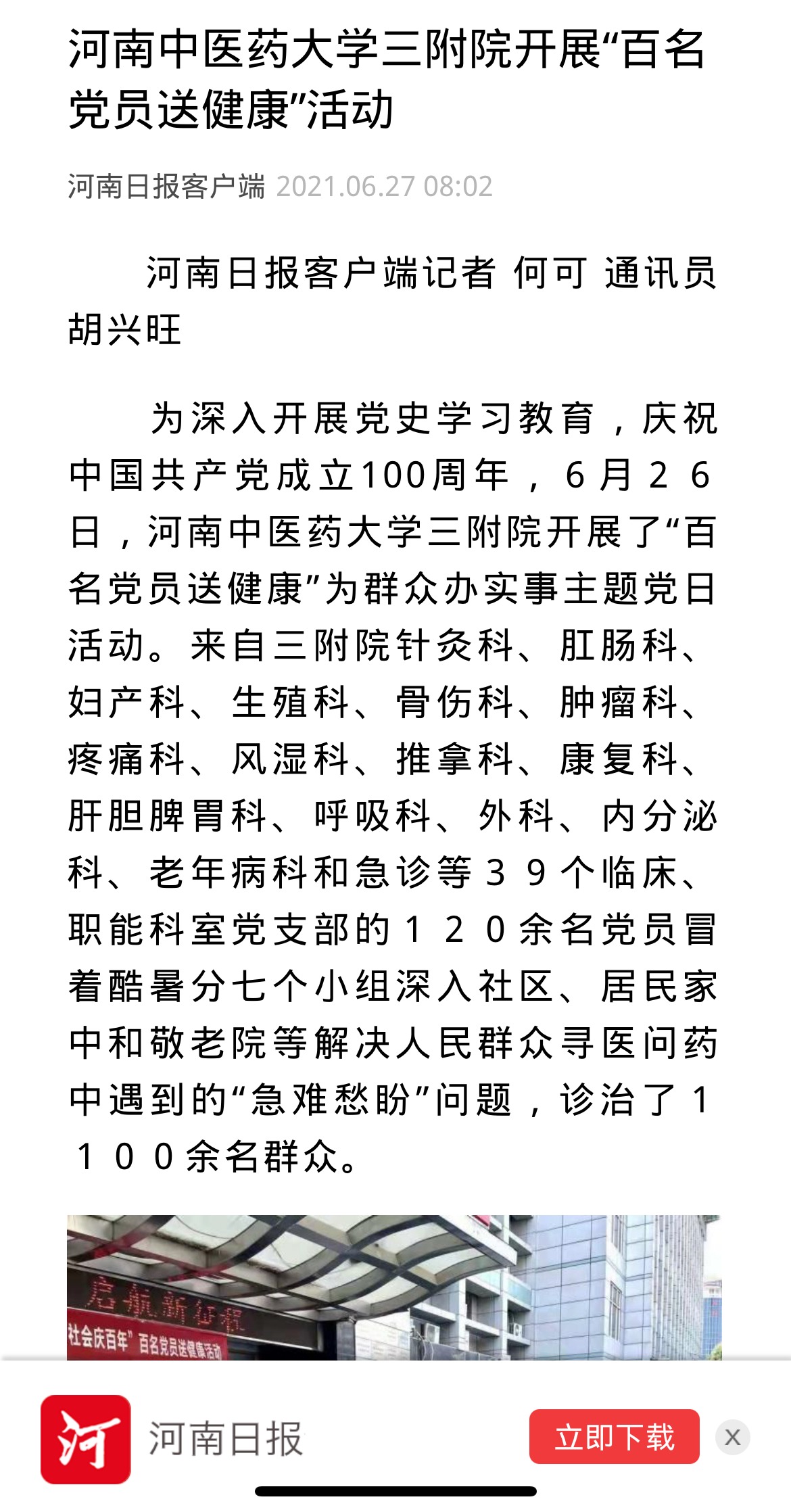 编者按:2021年6月27日,河南日报客户端、郑州日报官方客户端、大河网、大河报网、顶端新闻、正观未来等多家媒体对三附院“百名党员送健康”为群众办实事主题党日活动进行报道。