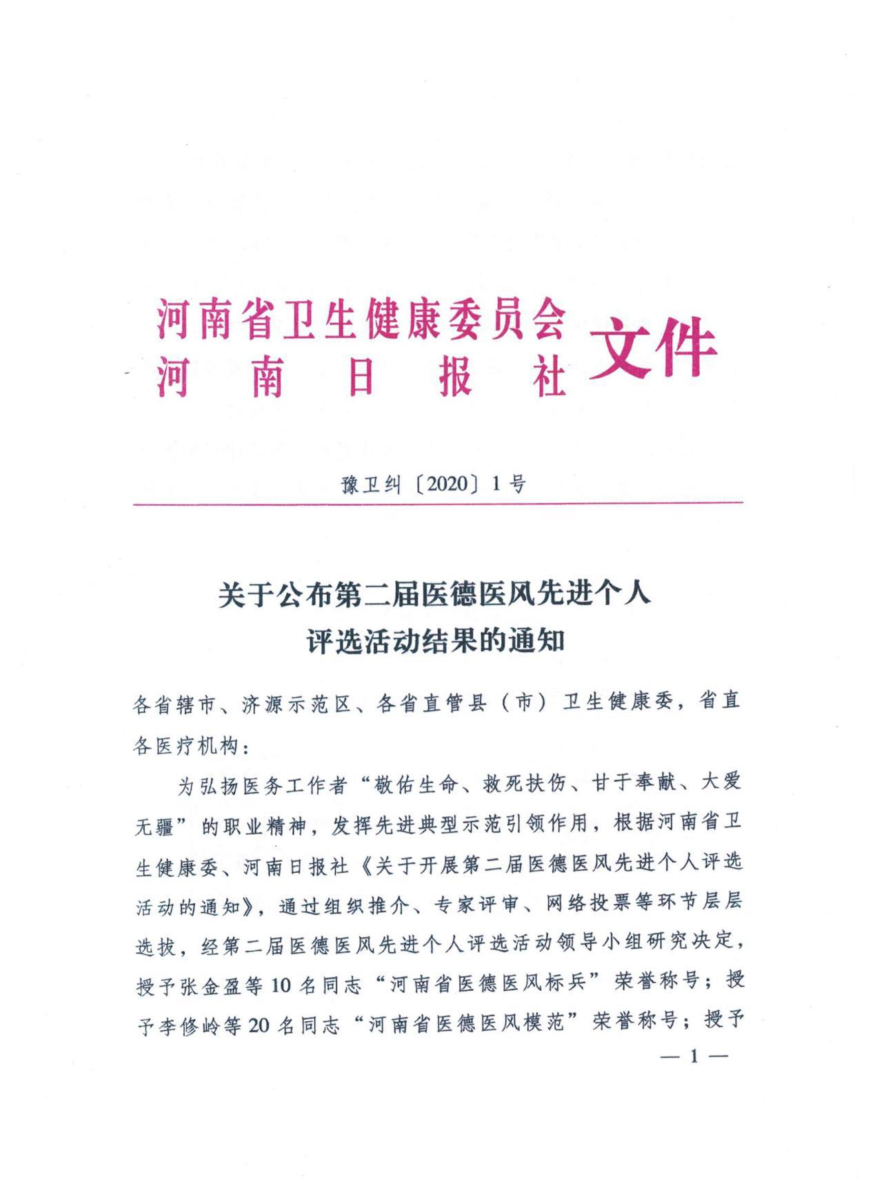本网讯(文/张芳 图/张艳云)近日,河南省卫生健康委发布《关于公布第二届医德医风先进个人评选活动结果的通知》,一附院赵文霞教授通过组织推介、专家评审、网络投票等环节的层层选拔,经第二届医德医风先进个人评选活动领导小组研究决定,获得“河南省医德医风标兵”荣誉称号。