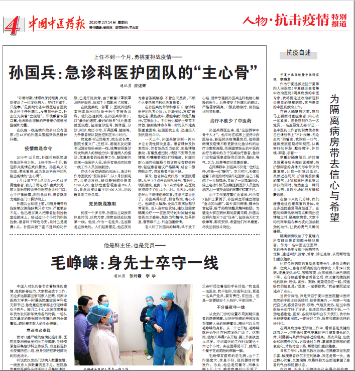 编者按:2020年2月14日,《中国中医药报》以《他是科主任,也是党员——毛峥嵘:身先士卒守一线》为题,对我校一附院急危重症医学科主任毛峥嵘先进事迹进行报道,现将全文刊发如下: