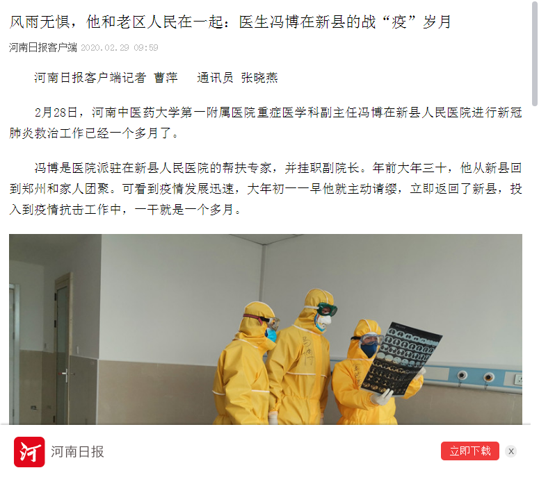 编者按:2020年2月29日,河南日报客户端对我校驻新县人民医院的帮扶专家冯博的战“疫”故事进行报道。现将全文刊发如下: