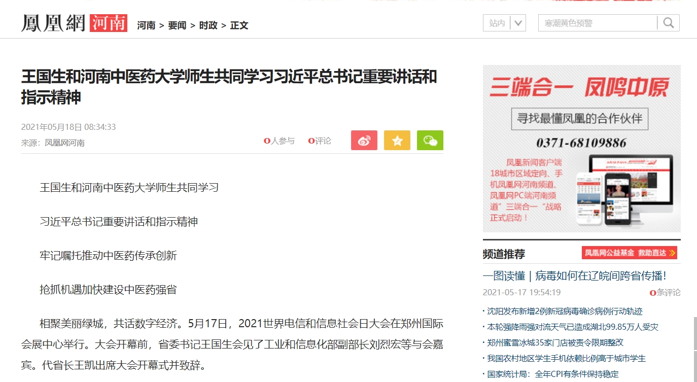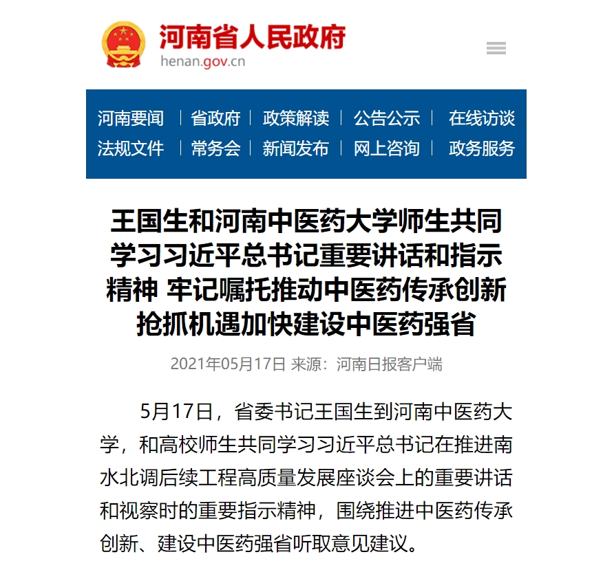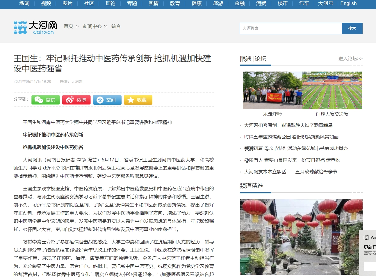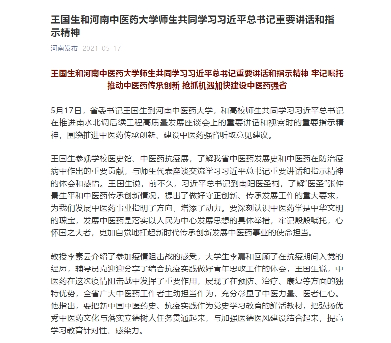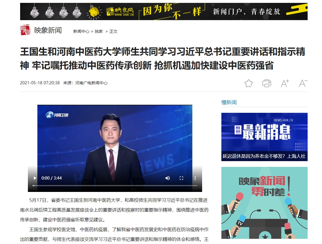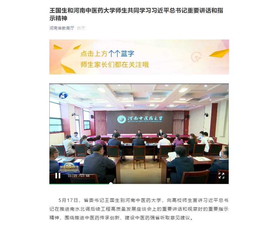 编者按:2021年5月17-18日,河南新闻联播、国际在线、河南日报、河南日报网、大河网、河南省人民政府网站、河南发布、河南省教育厅、搜狐新闻、凤凰网、网易号、映象新闻等多家媒体对省委书记王国生与我校师生共同学习习近平总书记重要讲话和指示精神进行报道。