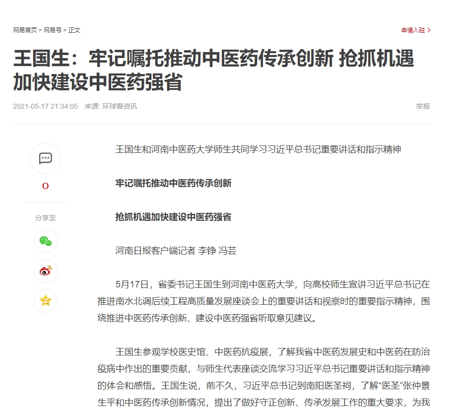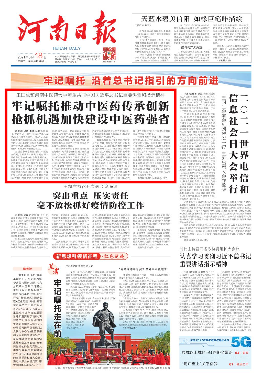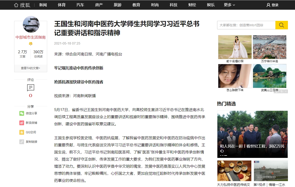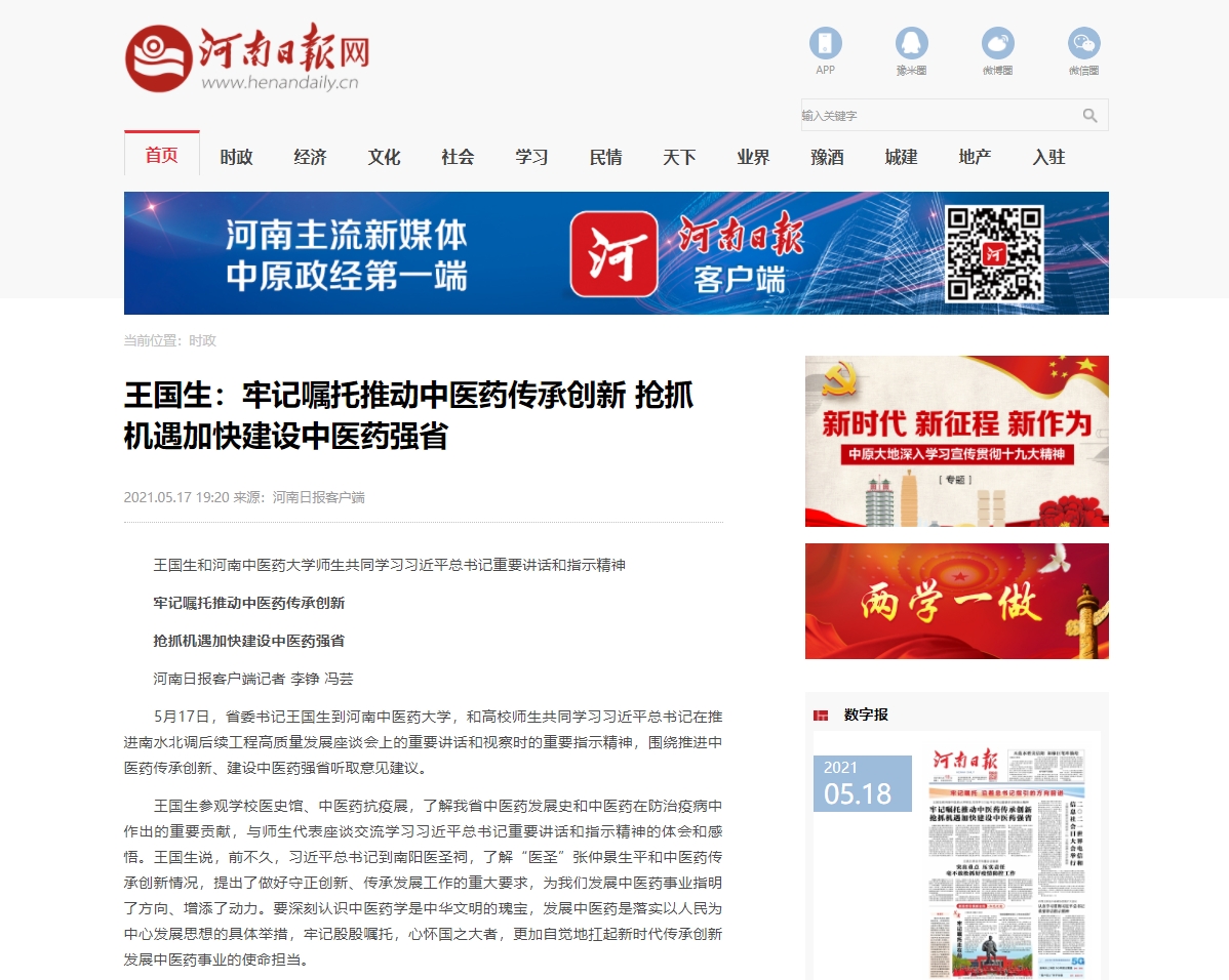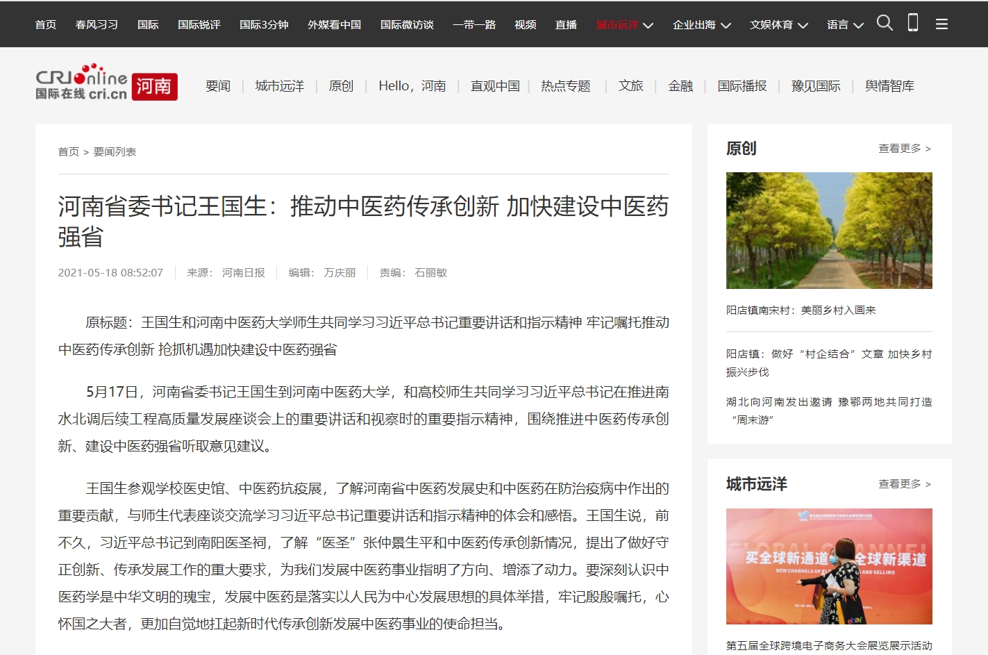编者按:2021年5月17-18日,河南新闻联播、国际在线、河南日报、河南日报网、大河网、河南省人民政府网站、河南发布、河南省教育厅、搜狐新闻、凤凰网、网易号、映象新闻等多家媒体对省委书记王国生与我校师生共同学习习近平总书记重要讲话和指示精神进行报道。