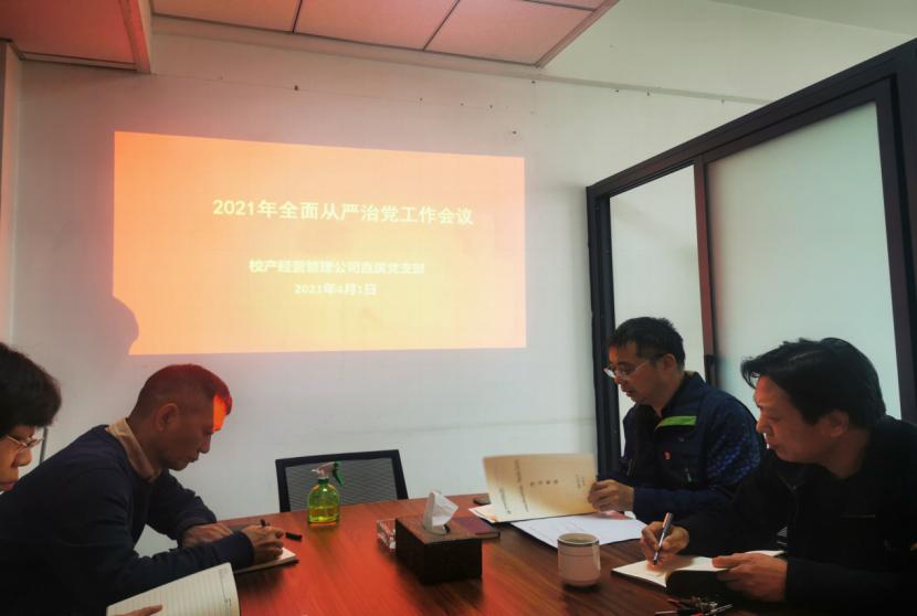 本网讯(文/周伟 图/贾姝)为认真贯彻落实学校全面从严治党工作会议精神,扎实推进全面从严治党工作,2021年4月1日下午,校产经营管理公司召开2021年全面从严治党工作会议。公司党员和科级以上干部参加会议,会议由公司党支部书记叶险峰主持。