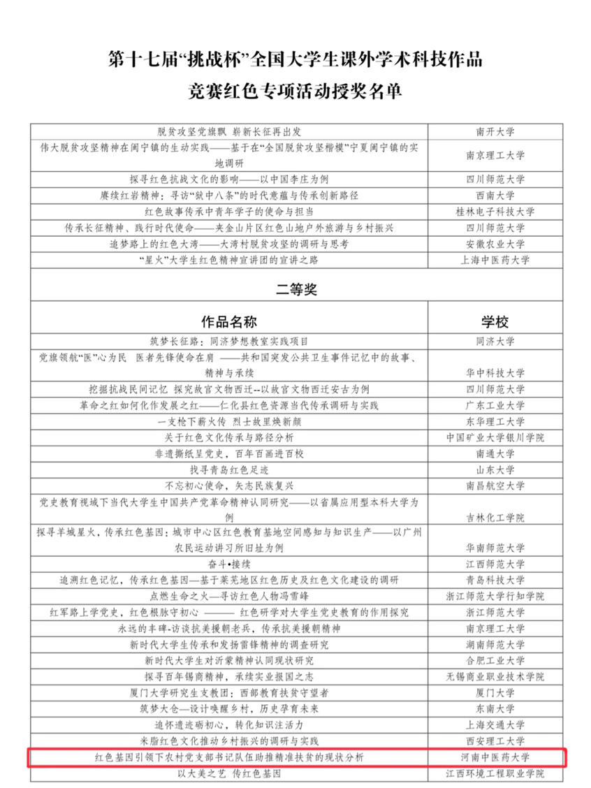 本网讯(文/图 陈占科)近日,第十七届“挑战杯”全国大学生课外学术科技作品竞赛红色专项活动落下帷幕。我校第一临床医学院参赛作品《红色基因引领下农村党支部书记队伍助推精准扶贫的现状分析》(项目负责人:李圆圆,指导老师:陈占科)荣获全国二等奖,是我校在该项赛事的最好成绩。