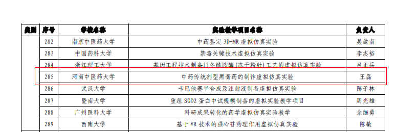 本网讯(文图/朱鑫)近日,教育部公布了2018年度国家虚拟仿真实验教学项目认定结果,我校王磊副教授主持的项目“中药传统剂型黑膏药的制作虚拟仿真实验”榜上有名。本次全国共申报766个项目,认定296个,来自全国184所高校。这也是继2018年6月教育部公布首批105个国家级虚拟现实仿真实验教学项目后,教育部再次认定的这一重量级教学项目。本项目的成功入选再一次彰显了我校的核心竞争力,标志着我校虚拟仿真实验教学、实验资源建设与创新再上一个新的台阶。