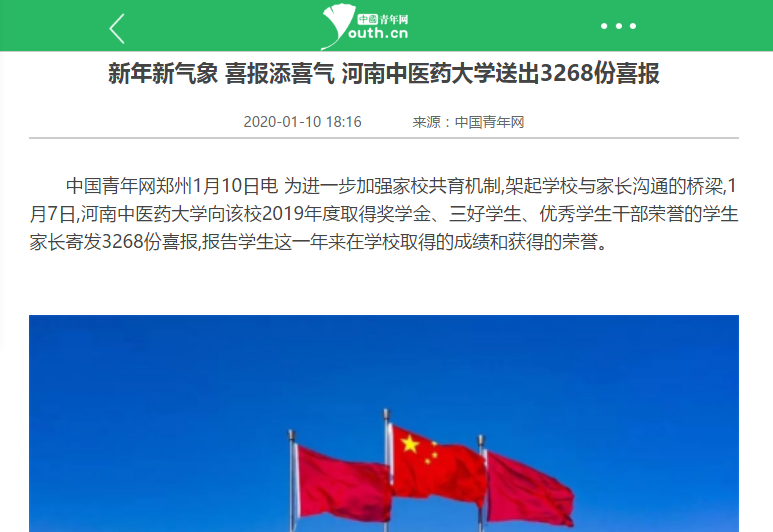 编者按:2020年1月10日,中青网、中宏网、大河网对我校新年寄送喜报进行报道。现将全文刊发如下: