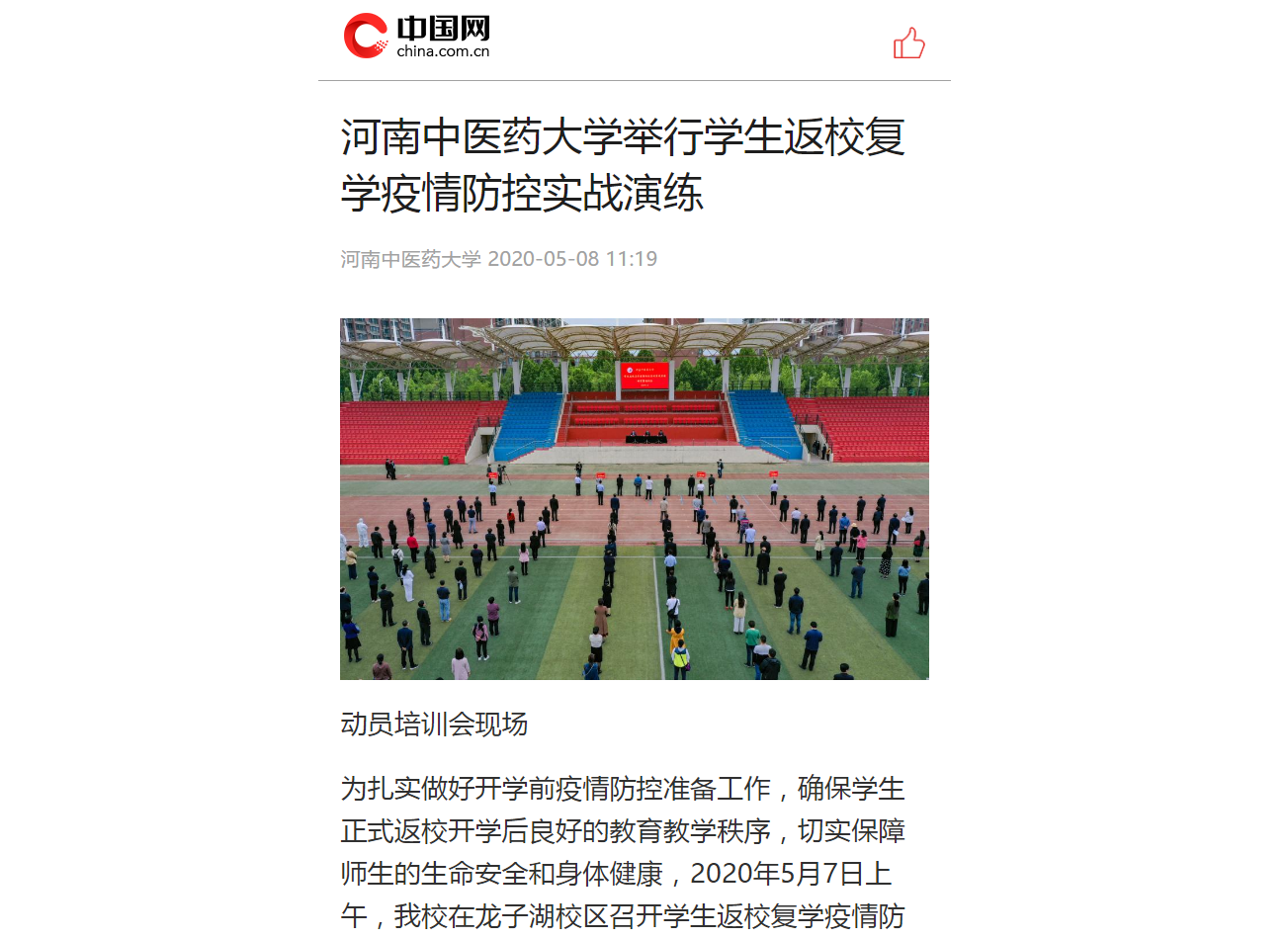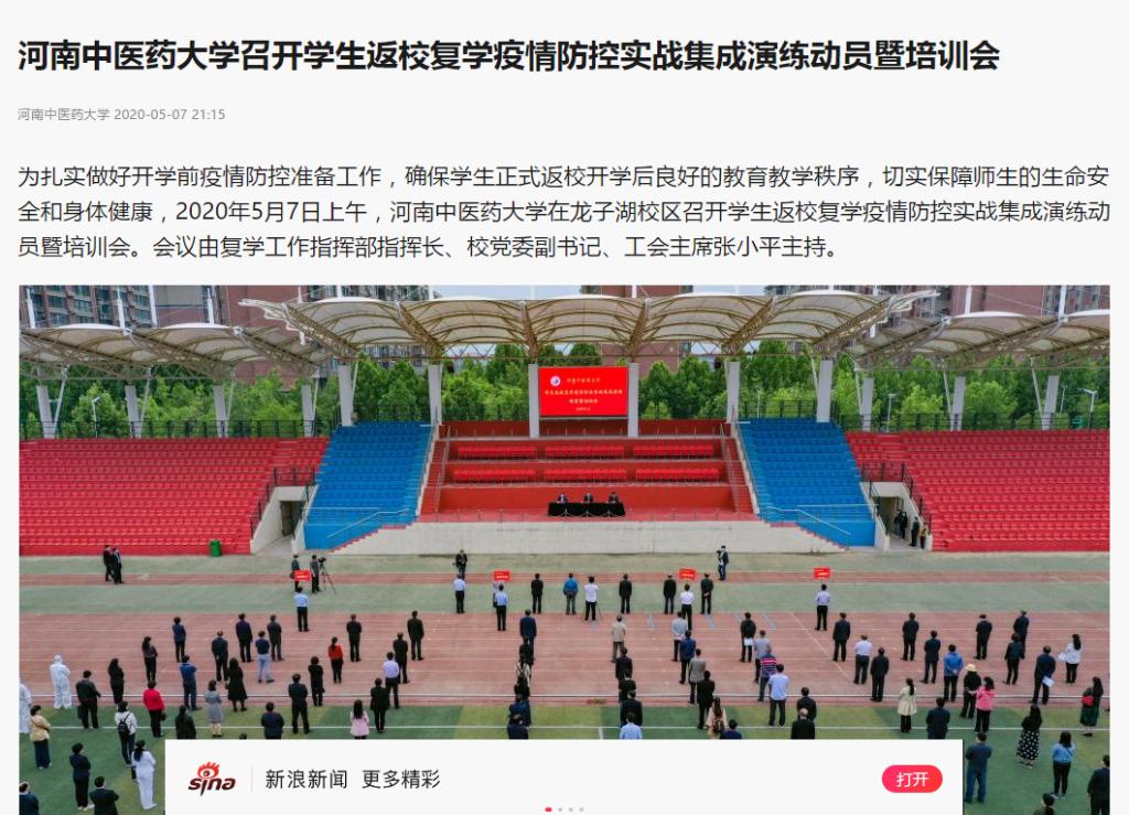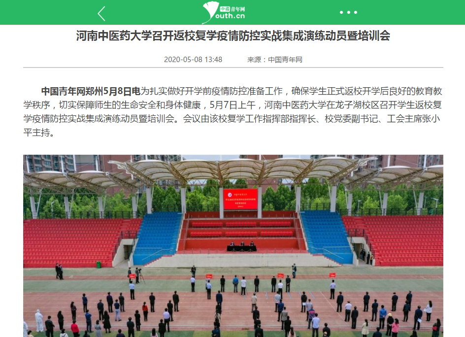2020年5月7日-8日,中国网、中青网、大河网、新浪新闻、网易新闻对我校召开学生返校复学疫情防控实战集成演练动员暨培训会进行报道。