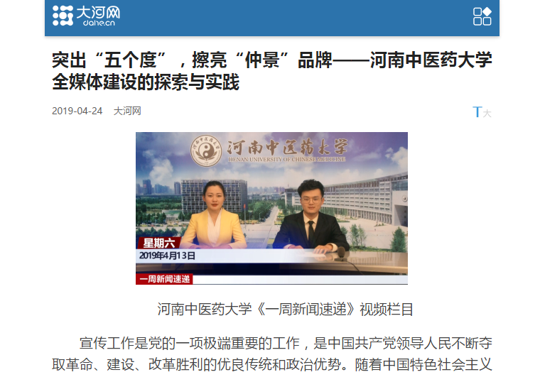 本网讯(文图/苗丹阳)不久前,河南报业集团大河网以《突出“五个度” 擦亮“仲景”品牌——亚盈app(中国)官方网站全媒体建设的探索与实践》为题,从“围绕‘五个有’,打造三支队伍”“突出‘五个度’,强化党建统领”“强化‘五位一体’,擦亮‘仲景’品牌”对我校全媒体建设的探索与实践进行报道,全面展示了我校的宣传思想工作的成绩和特点。