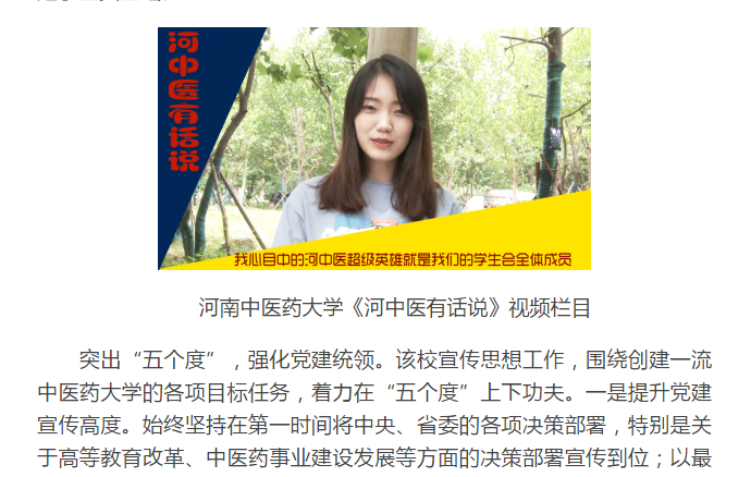 突出“五个度”,强化党建统领。该校宣传思想工作,围绕创建一流中医药大学的各项目标任务,着力在“五个度”上下功夫。一是提升党建宣传高度。始终坚持在第一时间将中央、省委的各项决策部署,特别是关于高等教育改革、中医药事业建设发展等方面的决策部署宣传到位;以最快速度将学校党委关于推进全面从严治党出台的各项制度,召开的重要会议,举办的培训交流,采取的各项举措、取得的成效等宣传到位。以2018年为例,全年发布有关党的建设新闻稿近200篇,占学校全年发稿量的20%。始终坚持用广大师生喜闻乐见、充满正能量、能形成共识的“干货”占领主流思想舆论阵地,让党的声音传得更开、传得更广、传得更深入。二是提升外宣工作广度。以2018年为例,光明日报、教育报,中国中医药报,河南日报,大河网等外媒报道我校稿件300余篇,比2017年同比增长51%,提升了学校的知名度和影响力。三是提升内涵建设宣传的深度。2018年,学校在内涵建设方面集中发力,重拳出击,在人才培养、学科建设、科学研究、师资队伍建设等方面均迈上了新台阶,全年发布内涵建设稿件近500篇,占全年发稿量的42%。四是提升展示师生风采的亮度。为进一步提振精神,鼓舞士气,2018年共采访、宣传干部师生先进事迹共400余人次,充分展示了广大师生的靓丽风采。五是提升宣传矩阵打造的力度。通过出台系列规章制度,改版学校网页和校报,增设显示屏,整合新媒体平台,加强培训交流等,打造了全新的全校新媒体联盟,壮大了主流思想舆论阵地,构建了大宣传格局。