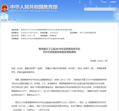 关于公布2019年度普通高等学校本科专业备案和审批结果的通知