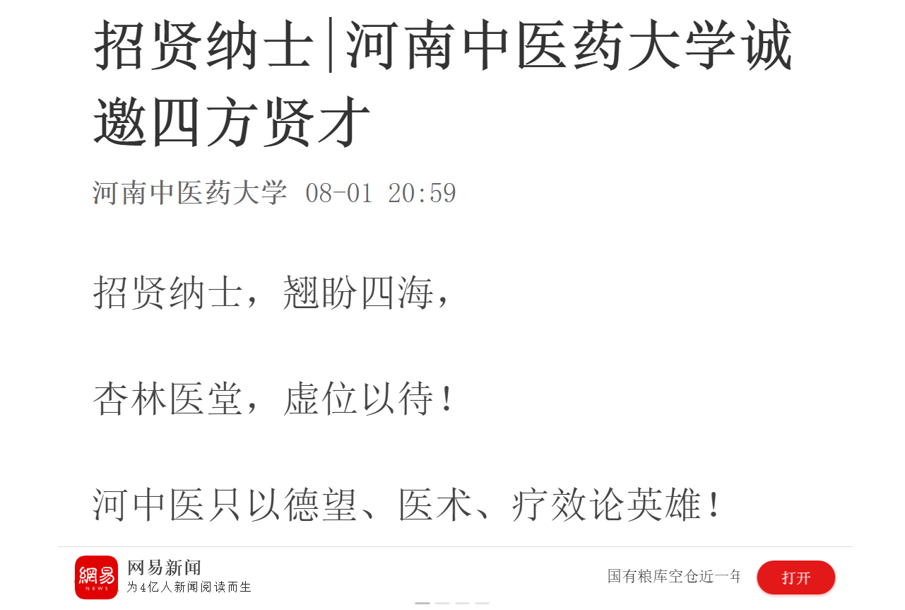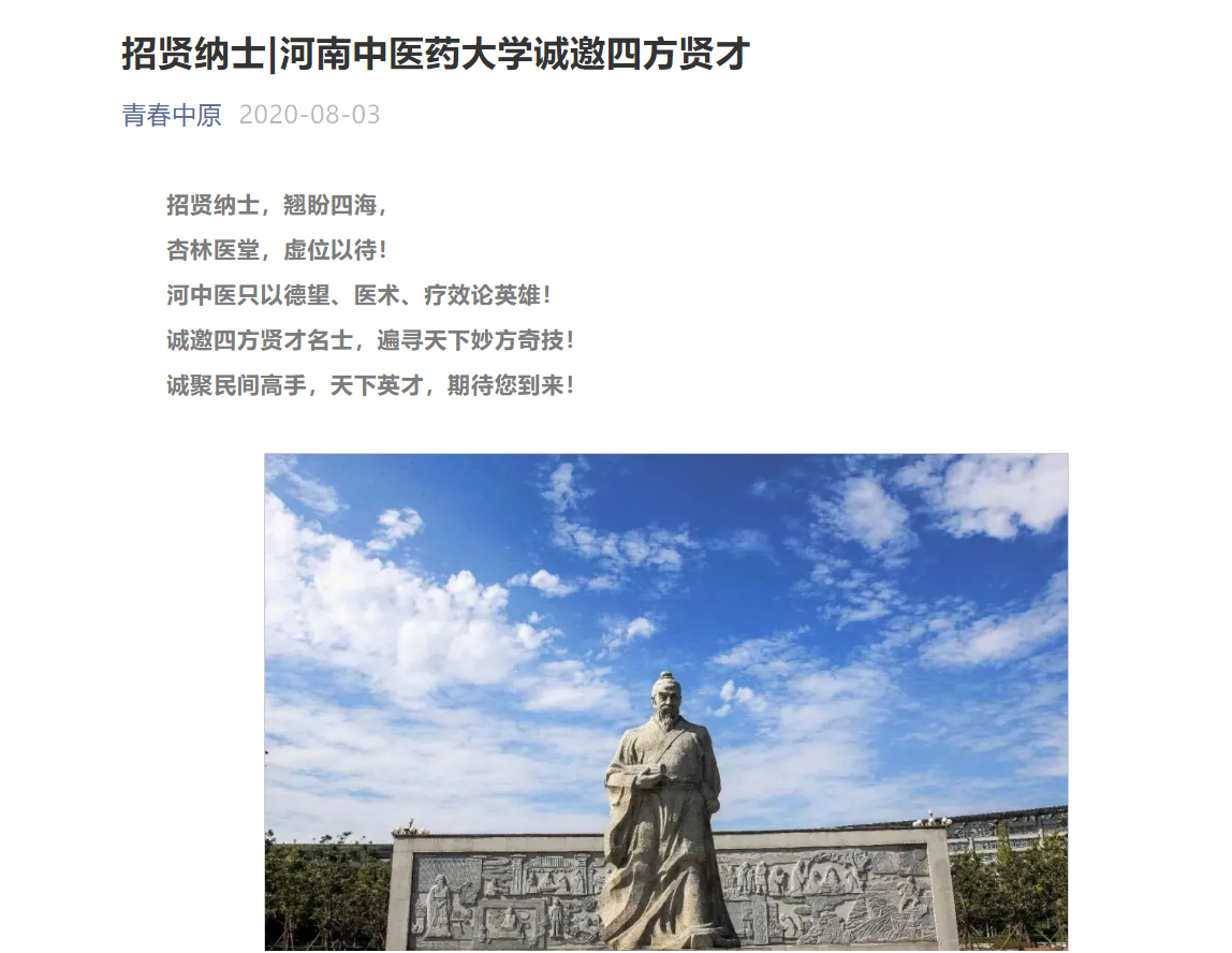 2020年8月3日,大河网、中青河南官方微博、青春中原、网易新闻、新浪新闻等媒体对我校诚邀各方贤才进行报道。