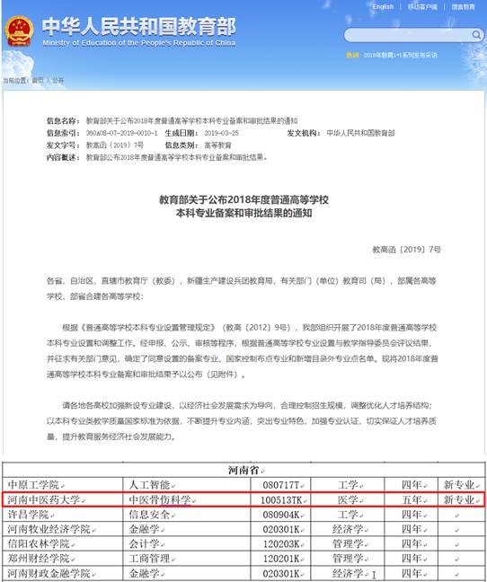 2019年,我校获批新增中药学博士后科研流动站;“中医骨伤科学”“食品卫生与营养学”“运动康复”三个本科专业获批设置,使我校成为目前国内唯一获批中医骨伤科学专业设置的高校;中医学、中药学、康复治疗学三个专业获首批国家级一流本科专业建设点,中西医临床医学、针灸推拿学两个专业获首批河南省一流本科专业建设点。