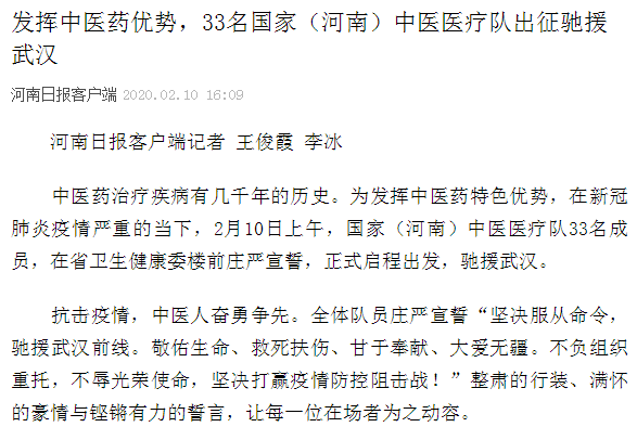 编者按:2020年2月10日-11日,河南日报客户端、人民看点新媒体对我校援助武汉国家(河南)中医医疗队启程进行报道。现将河南日报客户端全文刊发如下: