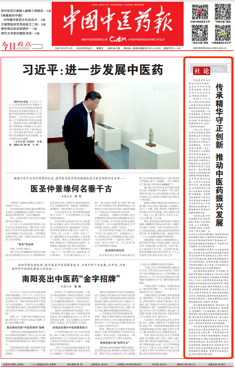 5月12日,习近平总书记来到医圣祠和南阳药益宝艾草制品有限公司,了解中医药发展和艾草制品产业发展情况。习近平总书记强调,“过去,中华民族几千年都是靠中医药治病救人。特别是经过抗击新冠肺炎疫情、非典等重大传染病之后,我们对中医药的作用有了更深的认识。我们要发展中医药,注重用现代科学解读中医药学原理,走中西医结合的道路。”习近平总书记深情的关怀、殷切的嘱托,让中医药系统干部职工无比激动、深受鼓舞、倍感振奋。中医药系统要把学习贯彻总书记重要指示精神作为当前和今后一个时期的重大政治任务,汇聚起推动中医药振兴发展的磅礴力量。