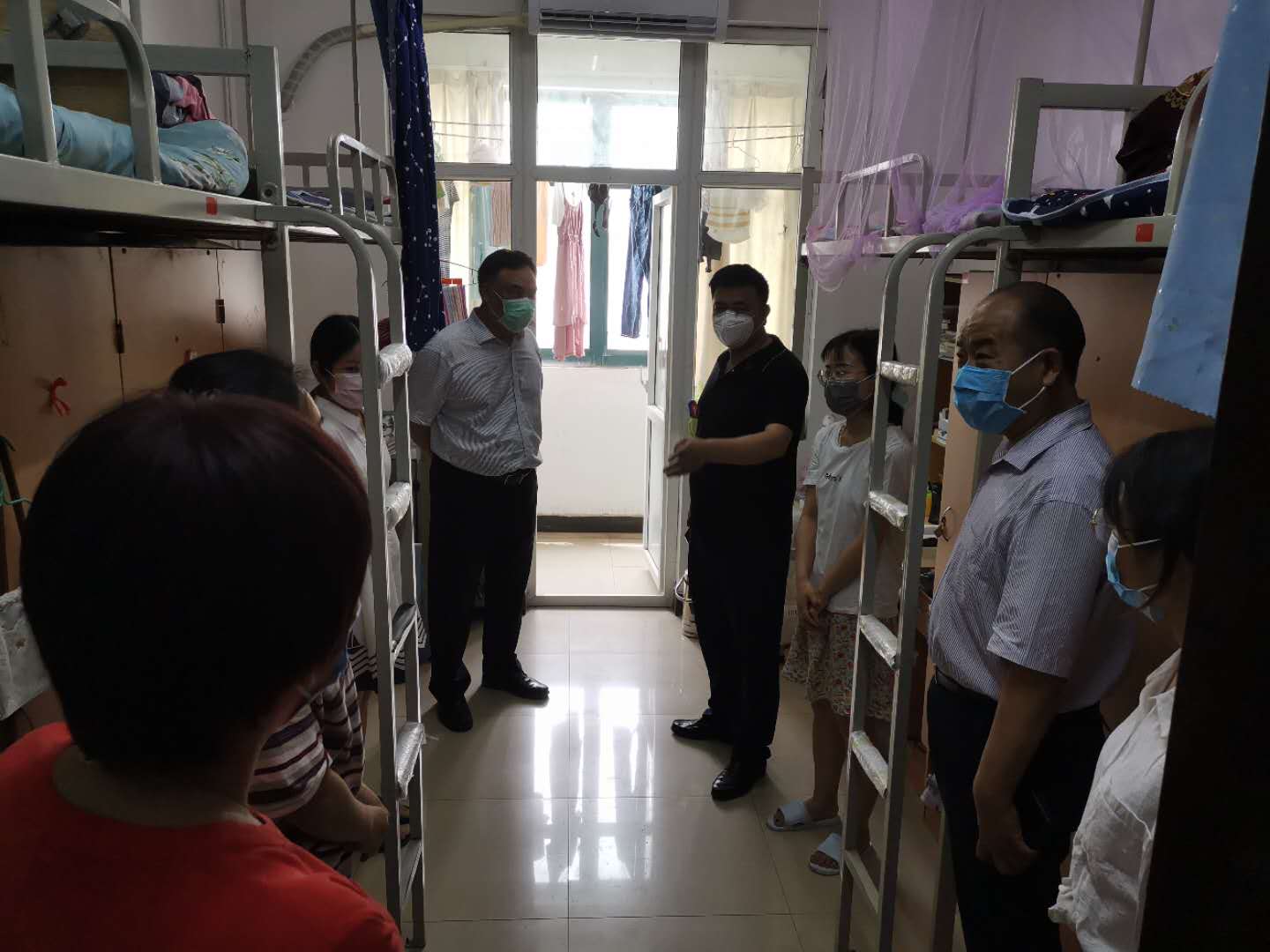 本网讯(文/郭彦霞 图/李志轩)2020年5月24日上午,校复学工作指挥部指挥长、党委副书记、工会主席张小平,校党委委员、副校长苗明三带领学生处及相关学院主管学生工作领导、辅导员深入学生宿舍看望返校学生。