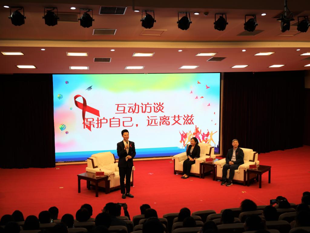 在“保护自己,远离艾滋”主题访谈环节中,任鲁豫对韩孟杰和孙丽君开展访谈,围绕艾滋病的传播途径、防治方法、后期治疗等问题,通过诙谐幽默的主持、现实案例生动详实的讲解,为在场师生上了一堂生动有趣的防艾公开课,倡导当代大学生知艾防艾,增强自我防护意识。访谈结束后,韩孟杰和任鲁豫共同为我校红丝带宣讲团授旗,并与现场师生一起进行“抗击艾滋病宣誓”。活动结束后,任鲁豫还与在场师生一起参加了“艾知多少”“绘艾传情”等十余项游园活动。
