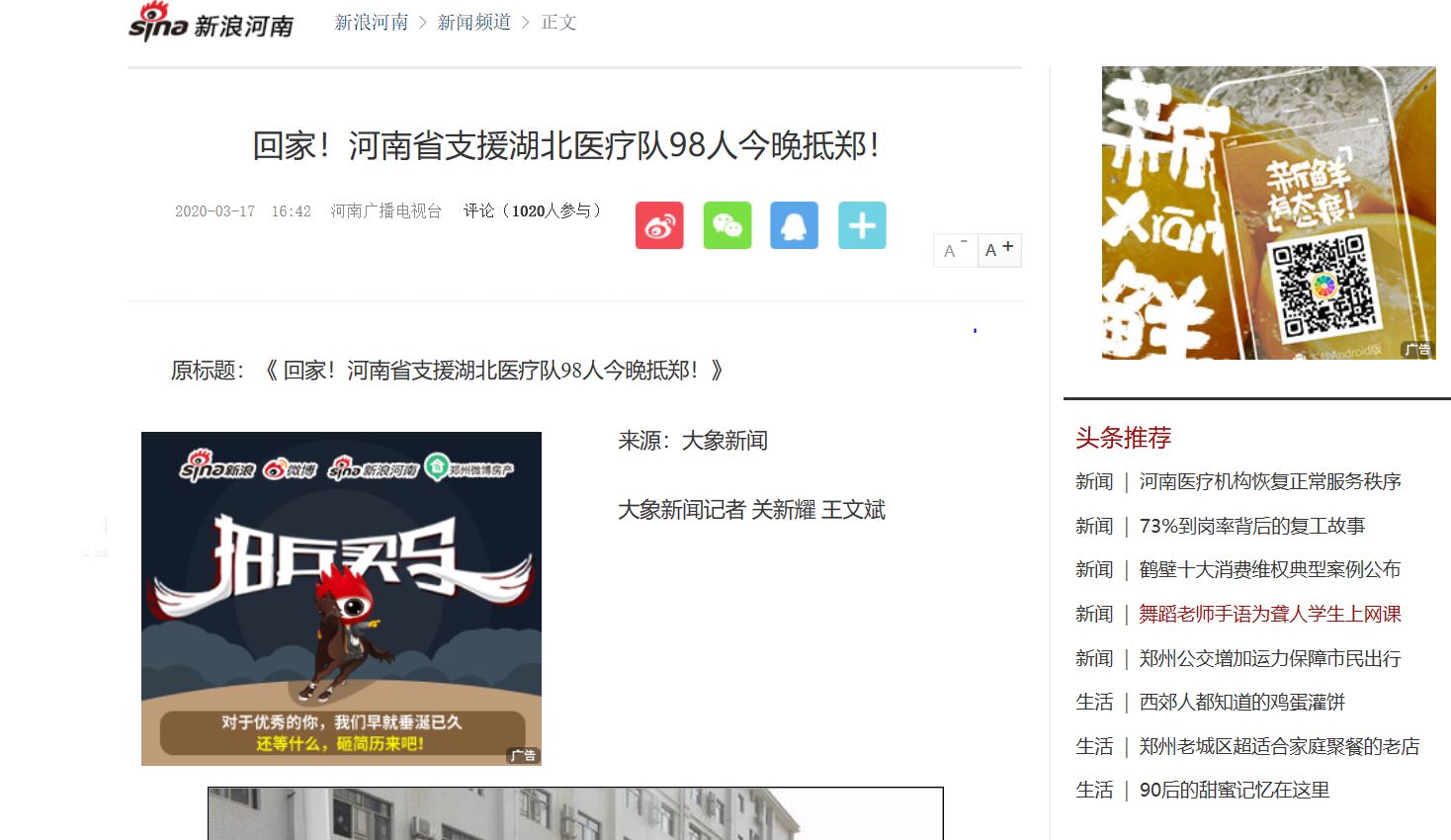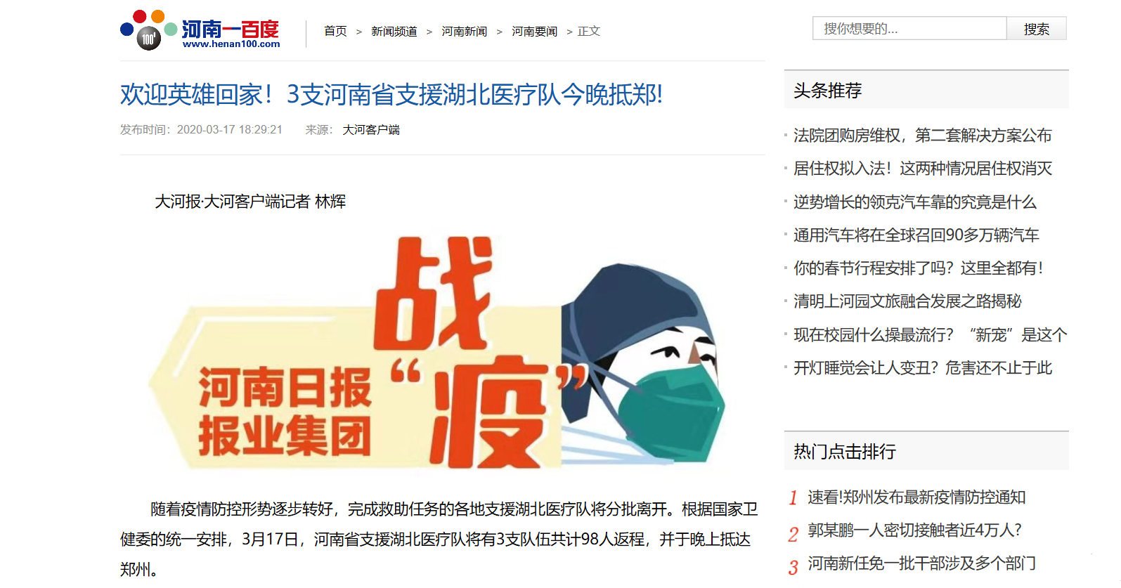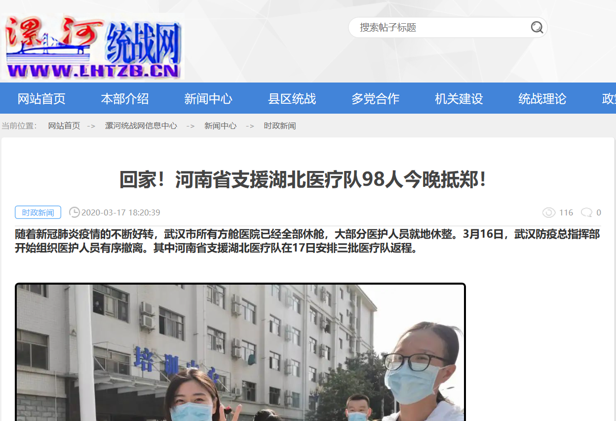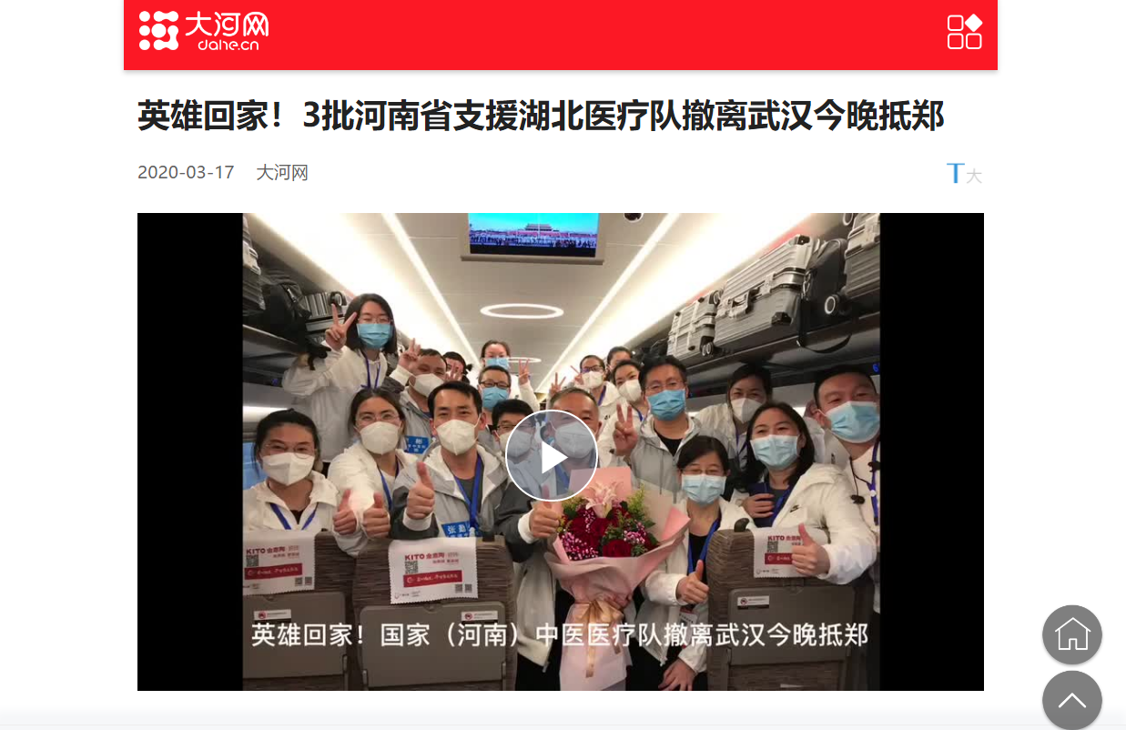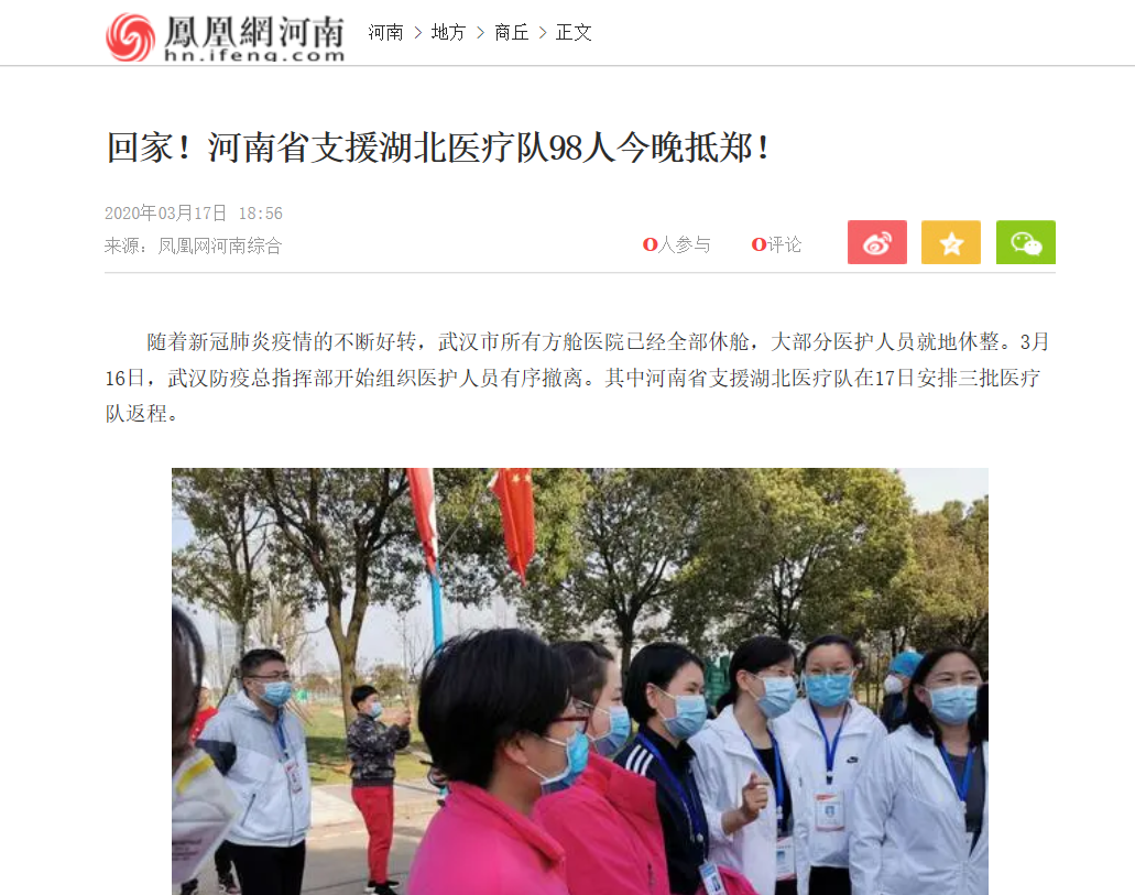编者按:2020年3月17日,大河网、河南一百度、凤凰网、新浪河南、漯河统战网等媒体对我校援鄂医疗队撤离武汉返郑进行报道。现将大河网全文刊发如下: