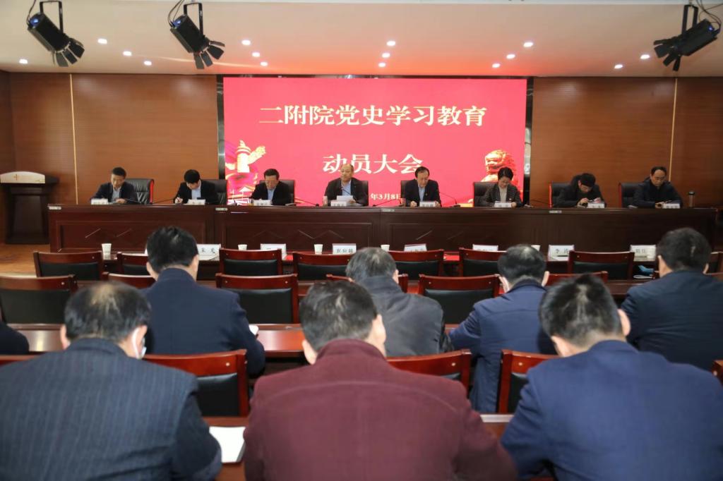 本网讯(文/徐明 图/李昕)2021年3月8日下午,二附院在行政楼一楼会议室召开党史学习教育动员大会,学习贯彻习近平总书记在党史学习教育动员大会上的重要讲话精神,贯彻落实省委、大学党委关于党史学习教育的工作要求。医院领导班子成员出席会议,各党总支书记、支部书记,科室主任、护士长等参加会议。动员大会由院长崔应麟主持。大会的召开正式拉开了二附院党史学习教育的序幕。