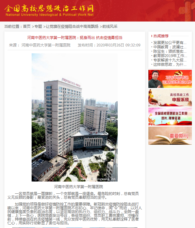 编者按:近日,全国高校思想政治工作网对我校一附院抗击疫情进行报道,现将全文刊发如下: