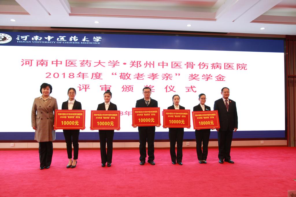 根据《亚盈app(中国)官方网站·郑州中医骨伤病医院2018年度“敬老孝亲”奖学金评选通知》要求,我校于2018年5月11日-11月30日期间开展了“敬老孝亲”奖学金评选活动。在活动期间,各院部高度重视,积极开展“敬老孝亲”主题宣传教育活动,共发掘、推选了59个“敬老孝亲”优秀大学生(团队)参与学校评审。经过个人(团队)申请、院(部)推荐、学校初审,最终15个候选人(团队)进入学校现场终审。通过每位候选人三分半钟的展示,经评委会打分和研究决定,针灸推拿学院2015级针灸推拿学本科二班王晓丹等5位同学或团队获得 “敬老孝亲”一等奖学金,基础医学院2014级仲景班田传玺等10位同学或团队获得 “敬老孝亲”二等奖学金。与会嘉宾和领导为获奖学生颁奖进行表彰。
