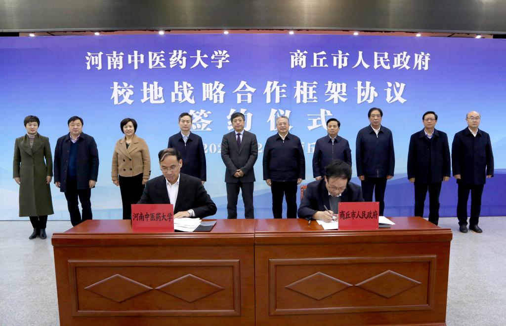 仪式上,许二平代表学校对长期关心和支持学校建设发展的商丘市委、市政府表示诚挚的感谢。他从文化传承、人才培养、科学研究和社会服务等方面介绍了学校的办学特色和发展成就。他表示,商丘市是国家历史文化名城、中华文明的发祥地之一,有着深厚的中医药文化积淀和丰富的中药材资源。学校与商丘市建立全面、深层次的战略伙伴关系是大势所趋、水到渠成。校地双方将以互惠互利、合作共赢为原则,在教学基地建设、人才培养、中医药资源开发等方面开展深入交流合作。他指出,校地双方签署战略合作框架协议就是贯彻落实党的十九届六中全会精神,把学校的人才、技术等诸多优势与商丘市优良的中医药资源相结合,加强产、学、研深度融合,提高人才培养质量,拓宽专业建设渠道。为实现健康中国、健康中原、健康商丘的宏伟蓝图不懈努力,为河南中医药事业的繁荣发展增光添彩。