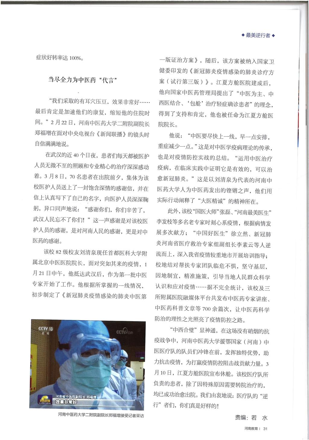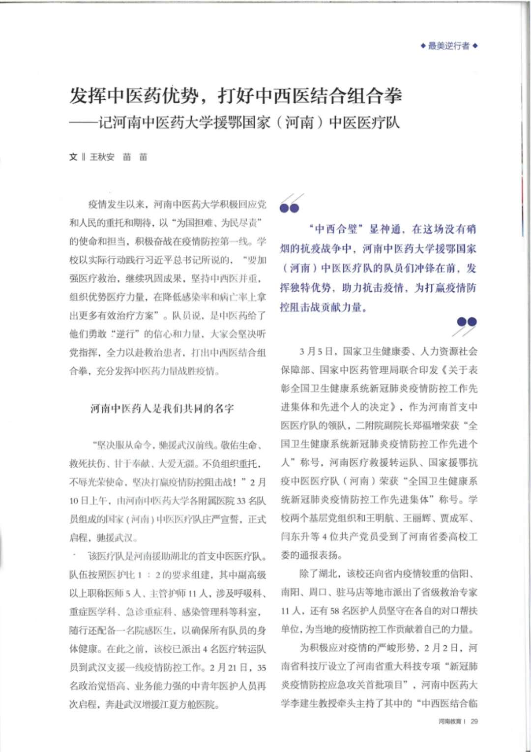 编者按:近日,河南教育04期对我校援鄂国家(河南)中医医疗队发挥中医药优势,打好中西医结合组合拳进行报道。现将全文刊发如下: