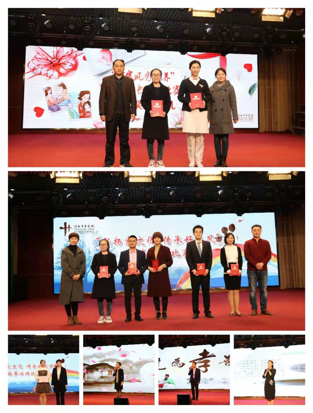 “弘扬家文化 传承好家风”故事演讲比赛。为深入贯彻落实习近平总书记提出的“注重家庭、注重家教、注重家风”的要求,传播职工身边的好家风,共同感受积极向上的价值导向,2019年3月7日下午,医院工会在会议中心举办“弘扬家文化 传承好家风”故事演讲比赛决赛。全院13个工会组推选出的27名选手,经过初选、预赛的选拔,11名选手参加此次决赛。医院纪委书记孟肖飞、工会主席张文学莅临现场观摩比赛。比赛现场,11名选手结合自身经历感悟,用真挚生动的语言、纯洁质朴的情感、真实感人的事例,向大家讲述了自己家的“家风”故事,一句句发人肺腑的话语,一段段情真意切的回忆让现场职工感动落泪,精彩的演讲博得掌声不断。经过评委们认真打分评选,骨伤工会组杨丹丹荣获一等奖;门诊组万福佳、妇儿组石钰获二等奖;外科组张丹、门诊组李晓芳、内科一组李飒获三等奖。