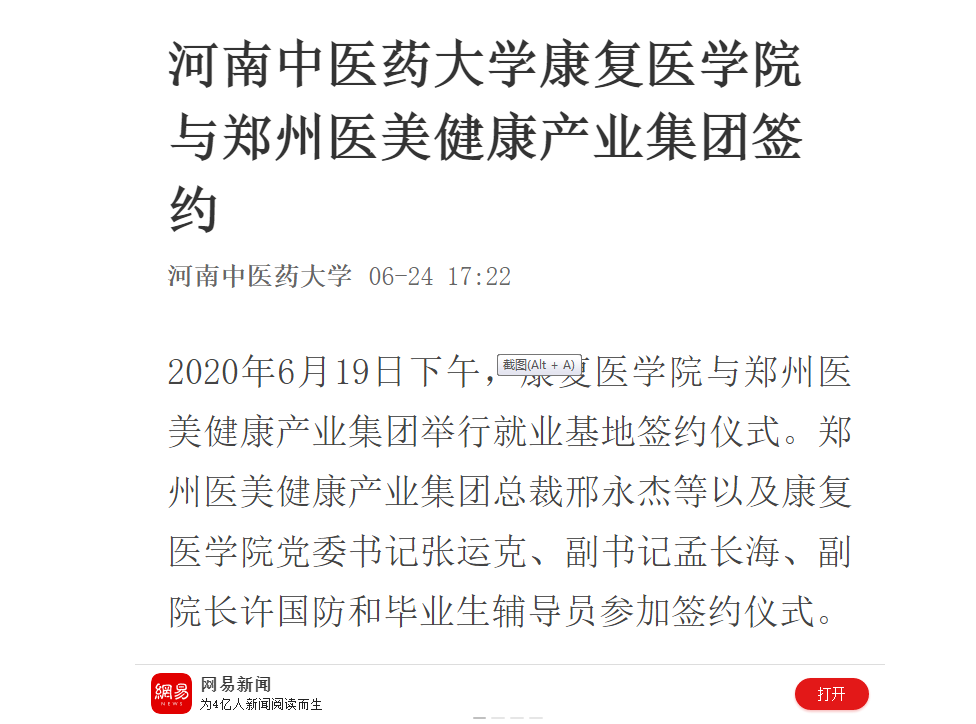 2020年6月23日-24日,新浪新闻、网易新闻对我校康复医学院与郑州医美健康产业集团签约进行报道。