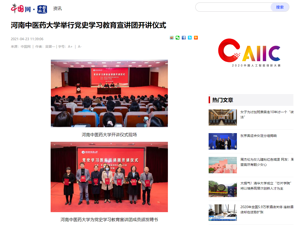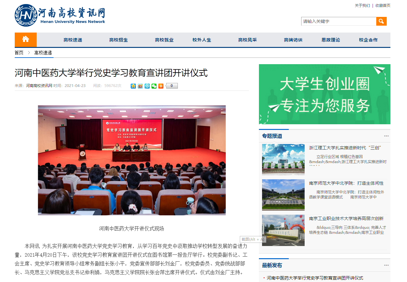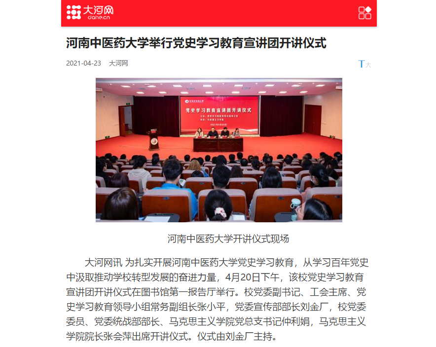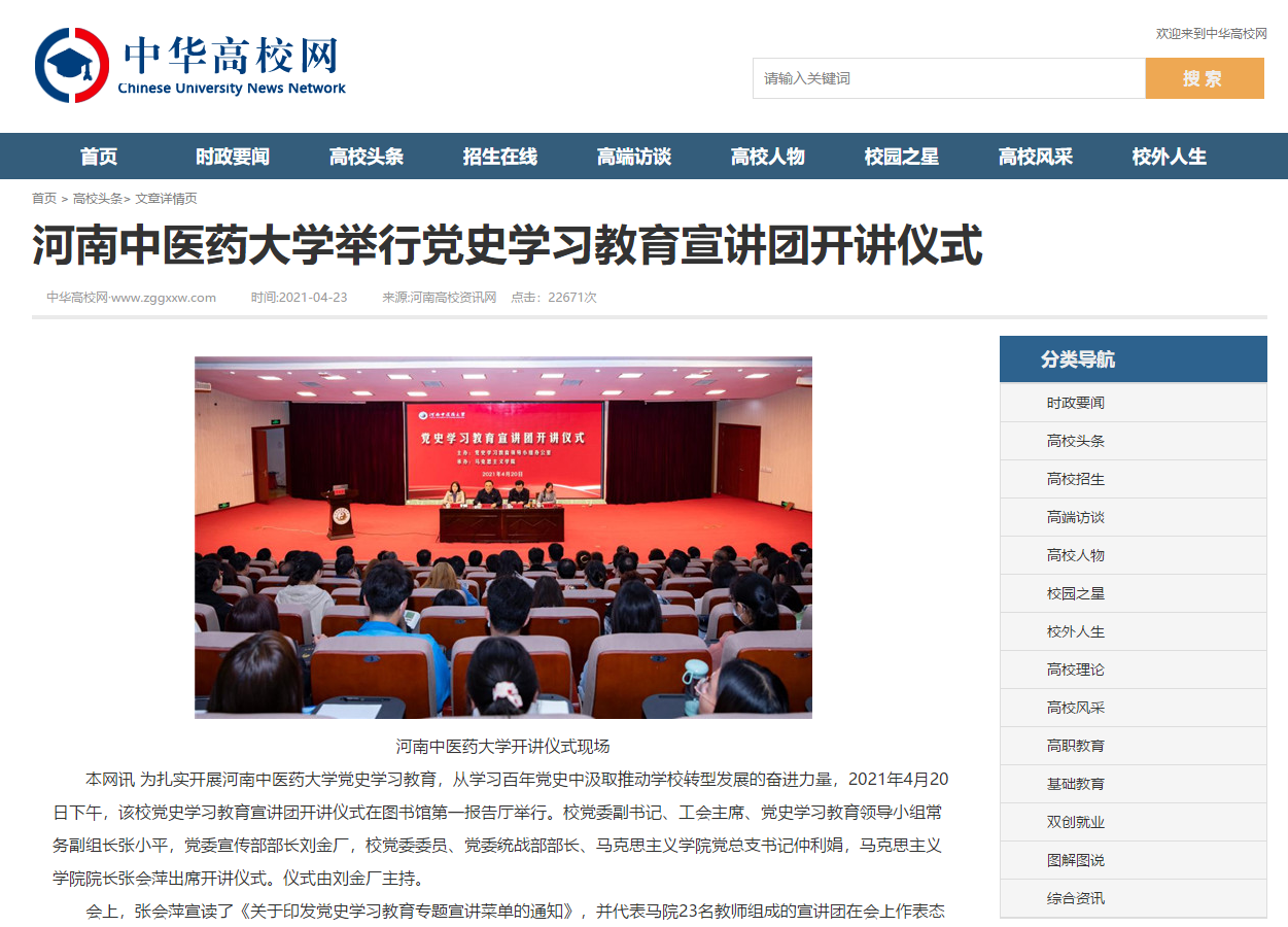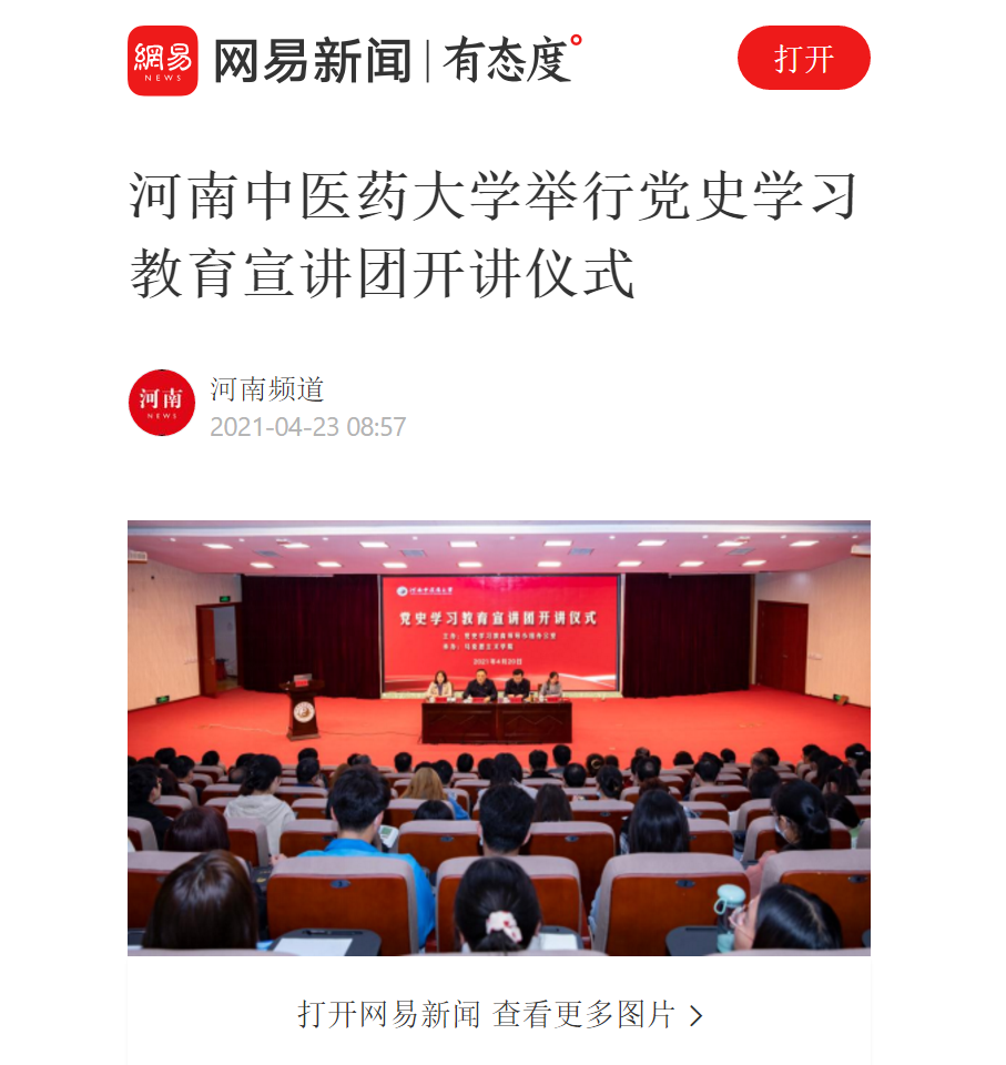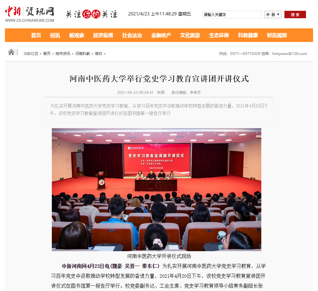 编者按:2021年4月23日,中国网、中新资讯网、中华高校网、大河网、河南高校资讯网、网易新闻等多家媒体对我校举行党史学习教育宣讲团开讲仪式进行报道。