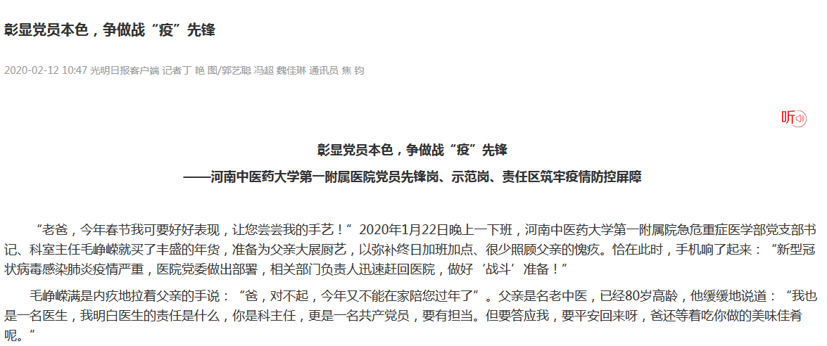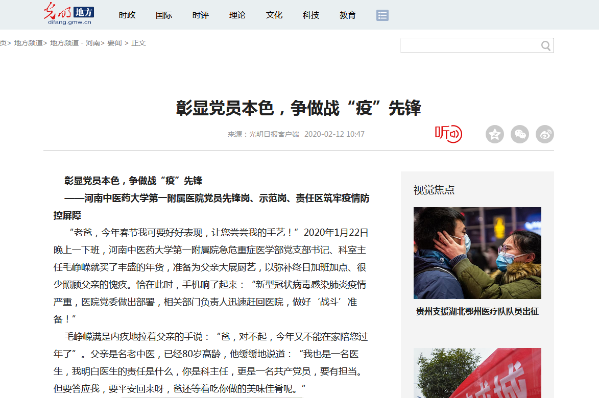 编者按:2020年2月11日-12日,学习强国、光明网、光明日报客户端对我校一附院党员筑牢疫情防控屏障进行报道。现将学习强国全文刊发如下: